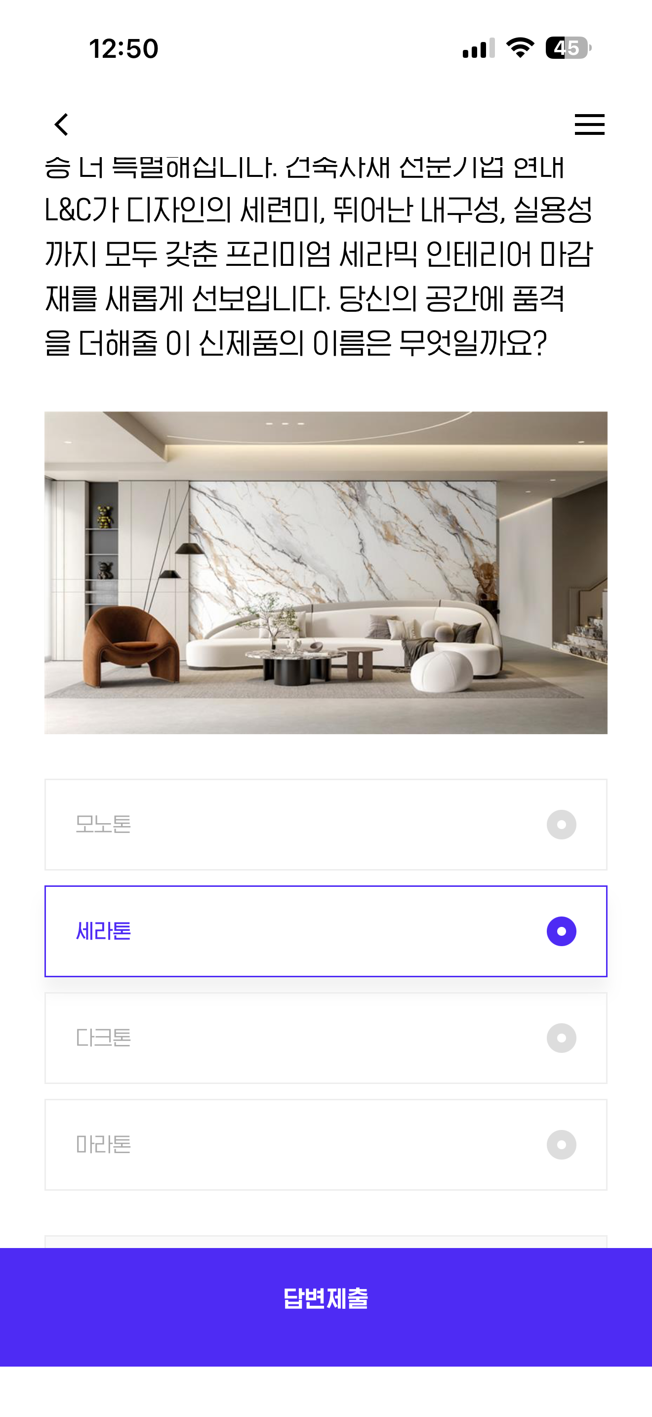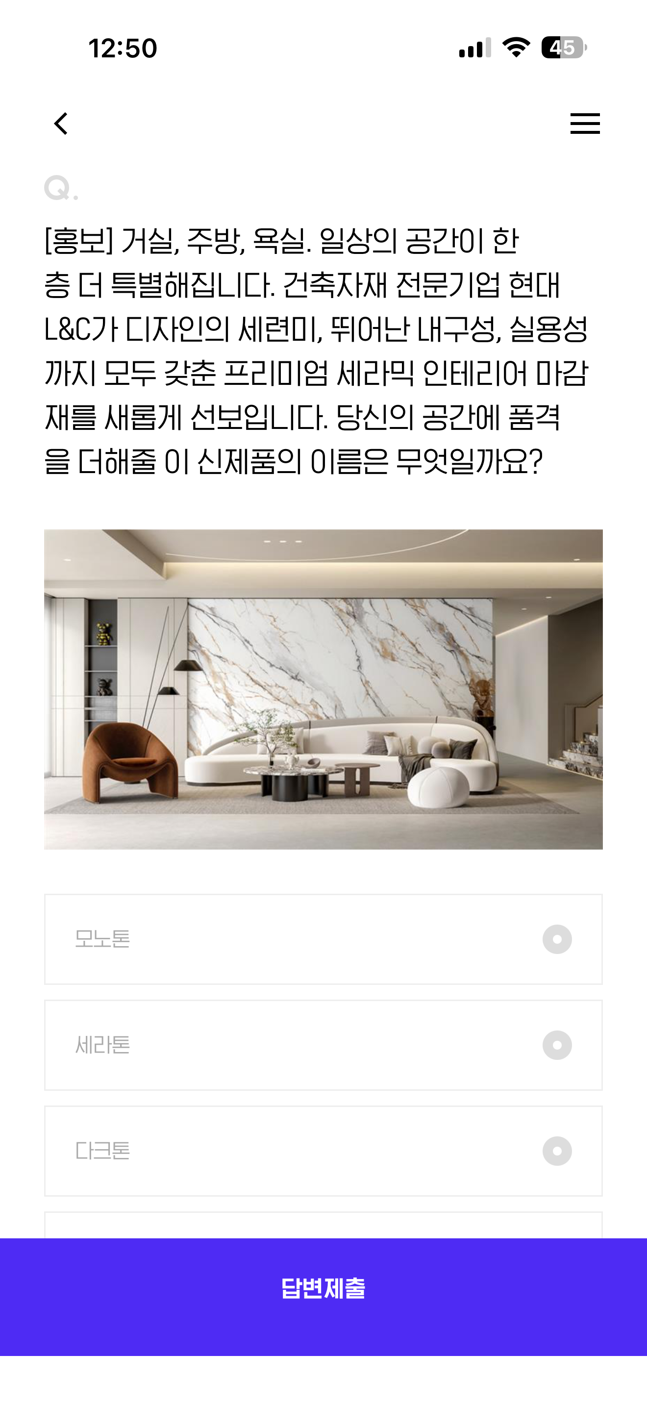 거실, 주방, 욕실, 일상의 공간이 한층 더 특별해집니다. 건축자재 전문기업 현대 L&C가 디자인의 세련미, 뛰어난 내구성, 실용성까지 모두 갖춘 프리미엄 세라믹 인테리어 마감재를 새롭게 선보입니다. 당신의 공간에 품격을 더해줄 이 신제품의 이름은 무엇일까요? 보기는 1. 모노톤 2. 세라톤 3. 다크톤 4. 마라톤 입니다