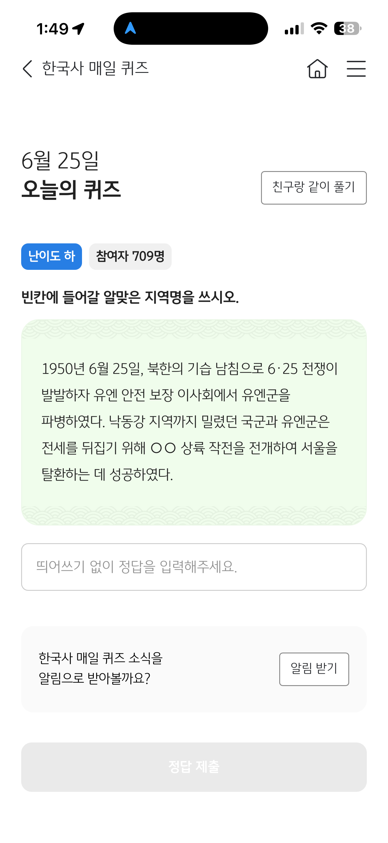 1950년 6월 25일, 북한의 기습 남침으로 6.25 전쟁이 발발하자 유엔 안전 보장 이사회에서 유엔군을 파병하였다. 낙동강 지역까지 밀렸던 국군과 유엔군은 전세를 뒤집기 위해 OO 상륙 작전을 전개하여 서울을 탈환하는 데 성공하였다. 주관식 퀴즈인데요.