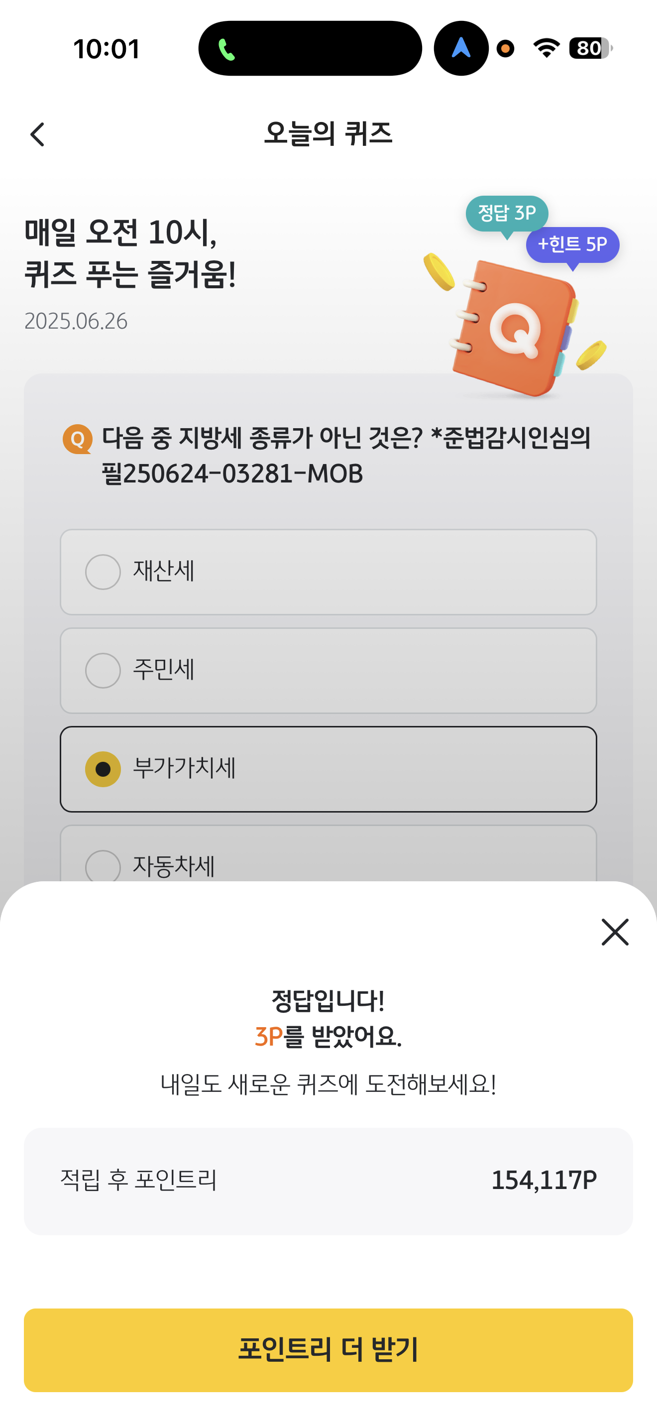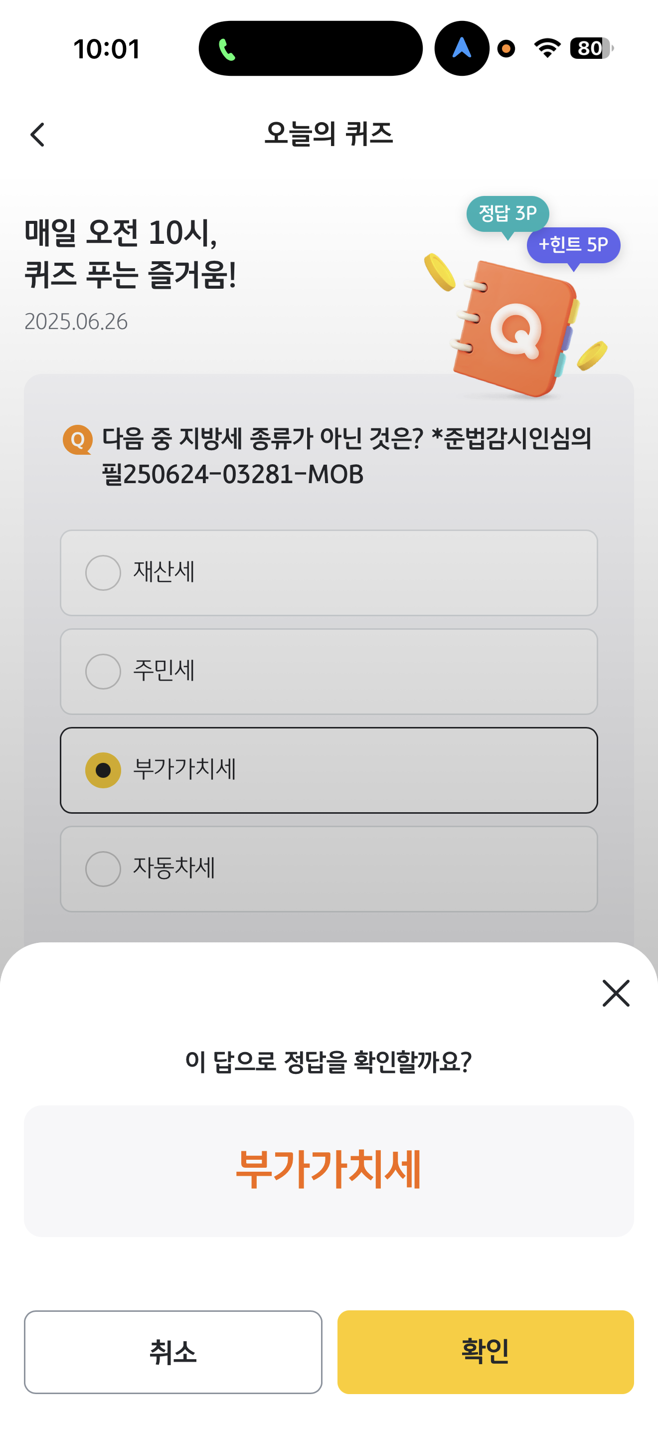 KB Pay 오늘의 퀴즈 정답은 부가가치세 입니다