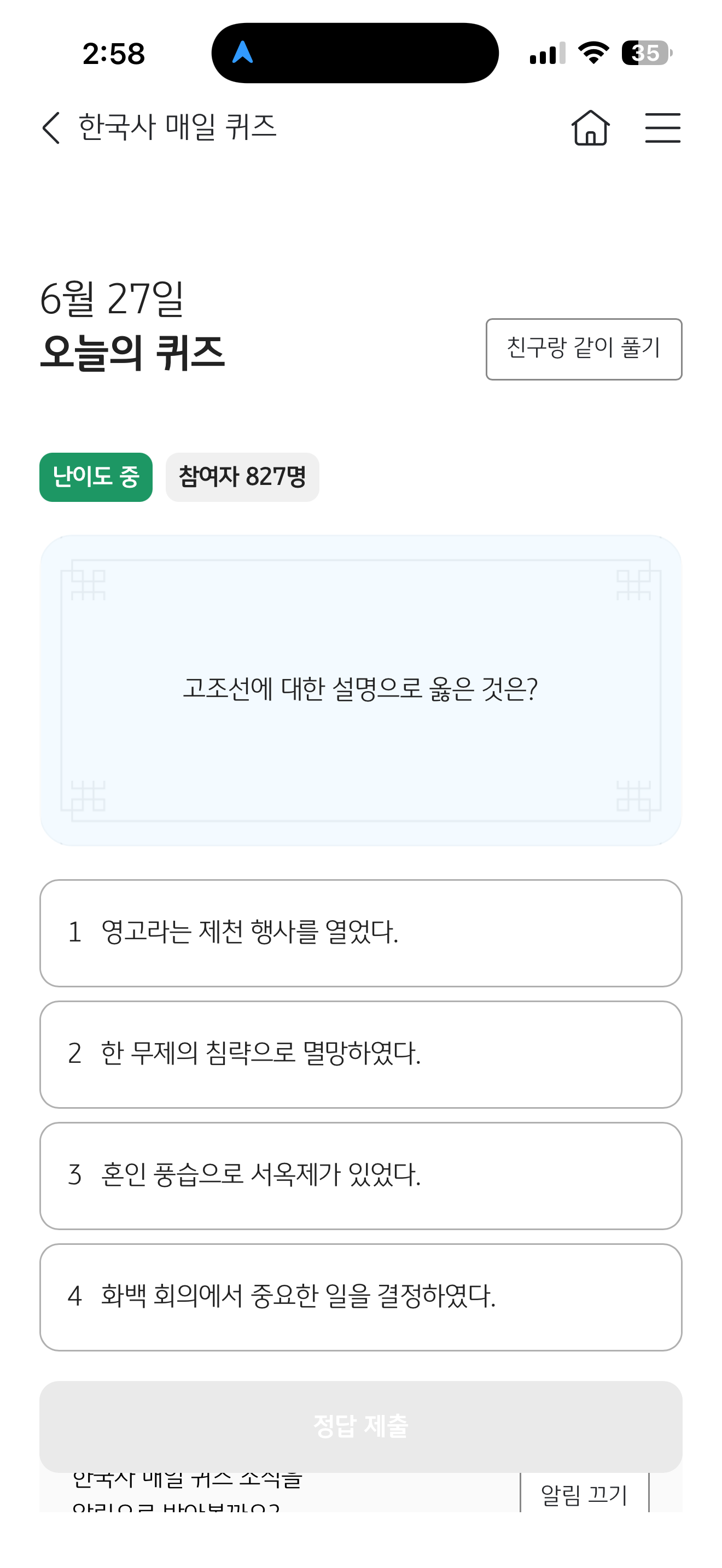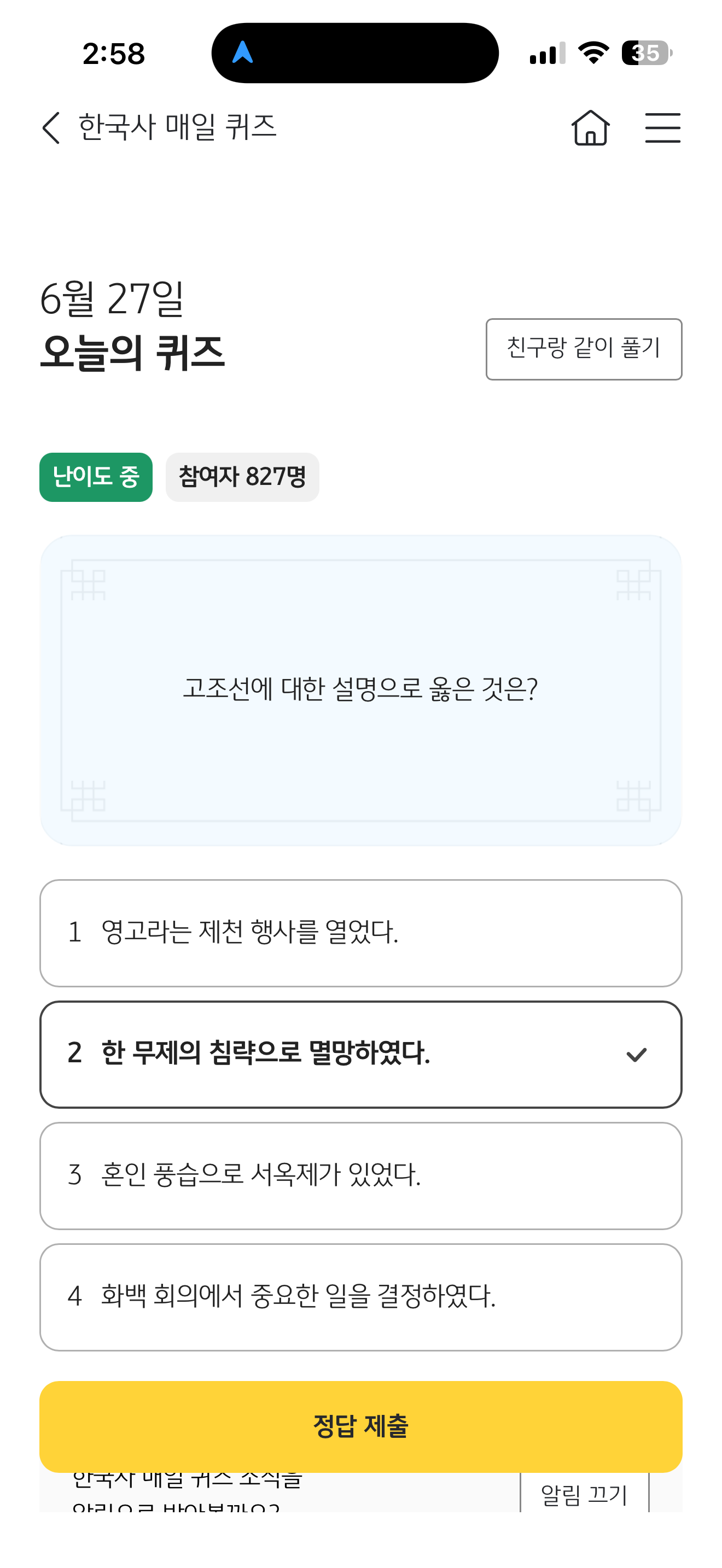 KB스타뱅킹 한국사 매일 퀴즈 6월 27일 문제입니다