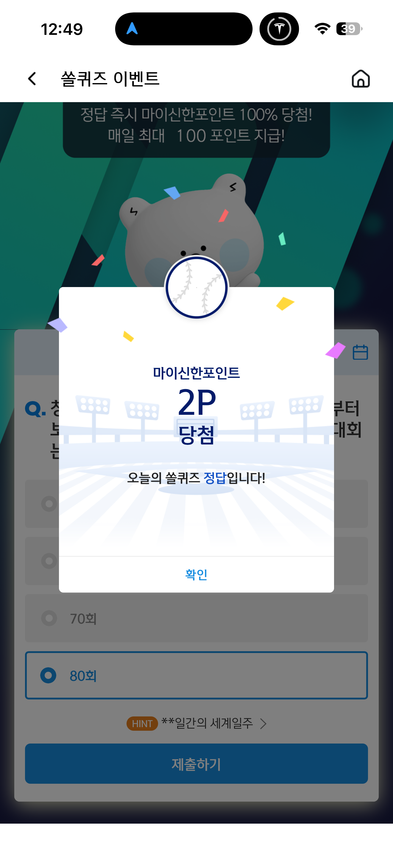 신한 슈퍼SOL 야구/상식 쏠퀴즈 정답은 80회 입니다