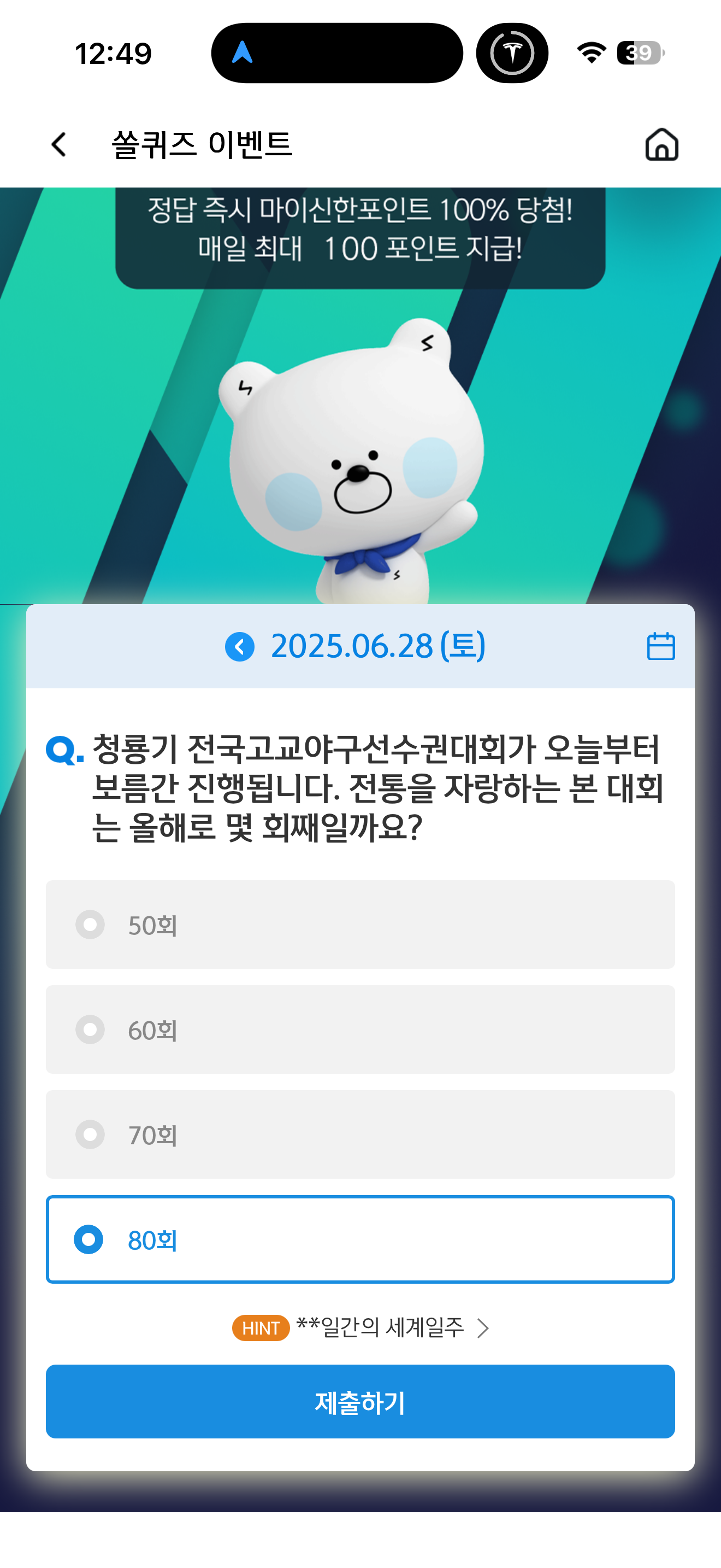 신한 슈퍼SOL 야구/상식 쏠퀴즈 정답은 80회 입니다