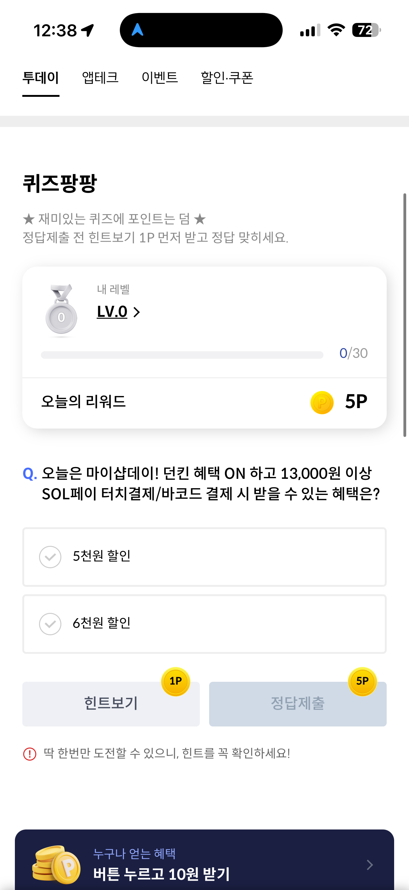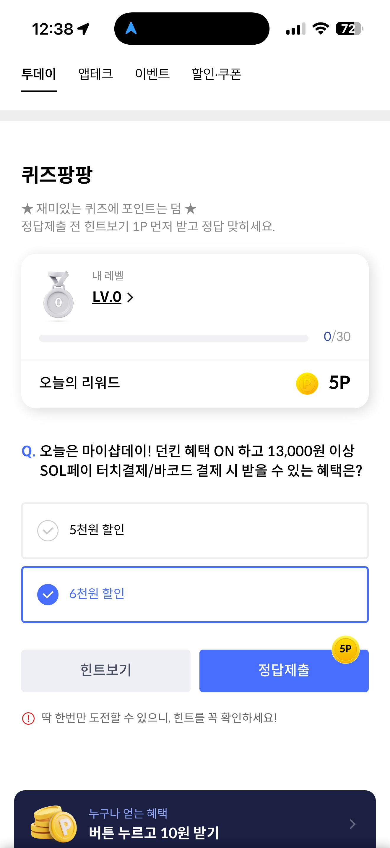 신한카드 퀴즈팡팡 정답은 6천원 할인 입니다