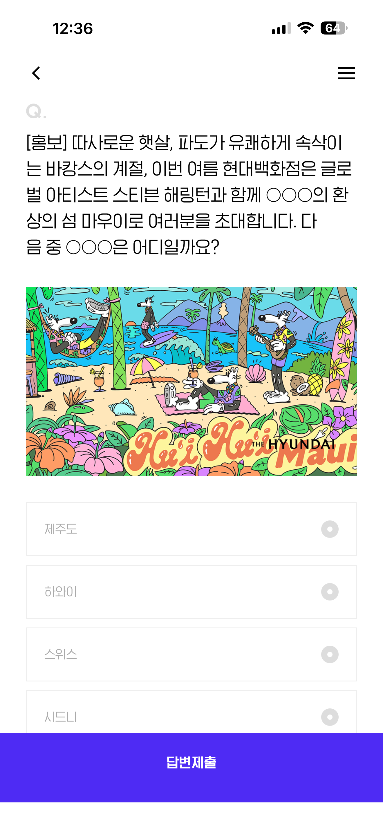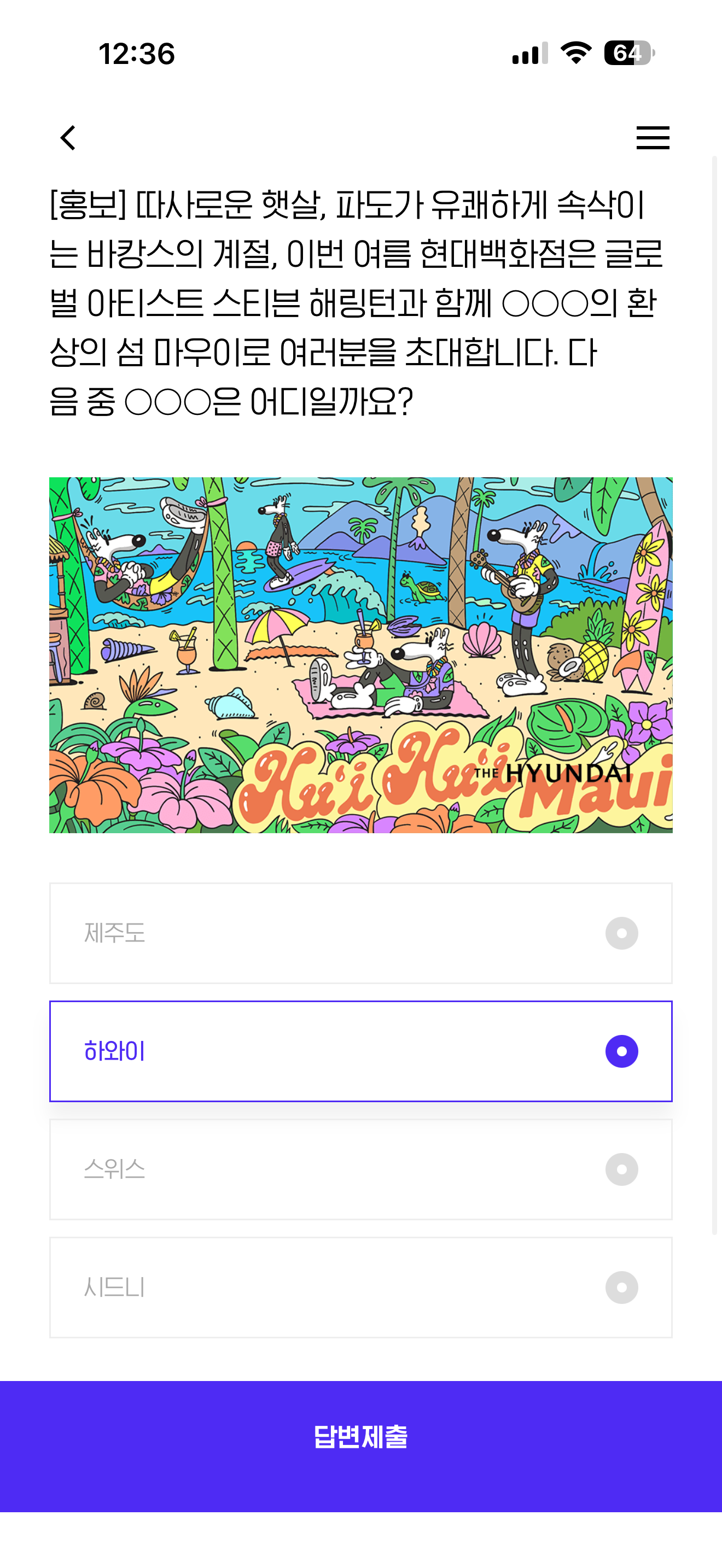 따사로운 햇살, 파도가 유쾌하게 속삭이는 바캉스의 계절, 이번 여름 현대백화점은 글로벌 아티스트 스티븐 해링턴과 함께 OOO의 환상의 섬 마우이로 여러분을 초대합니다. 다음 중 OOO은 어디일까요? 보기는 1. 제주도 2. 하와이 3. 스위스 4. 시드니 입니다