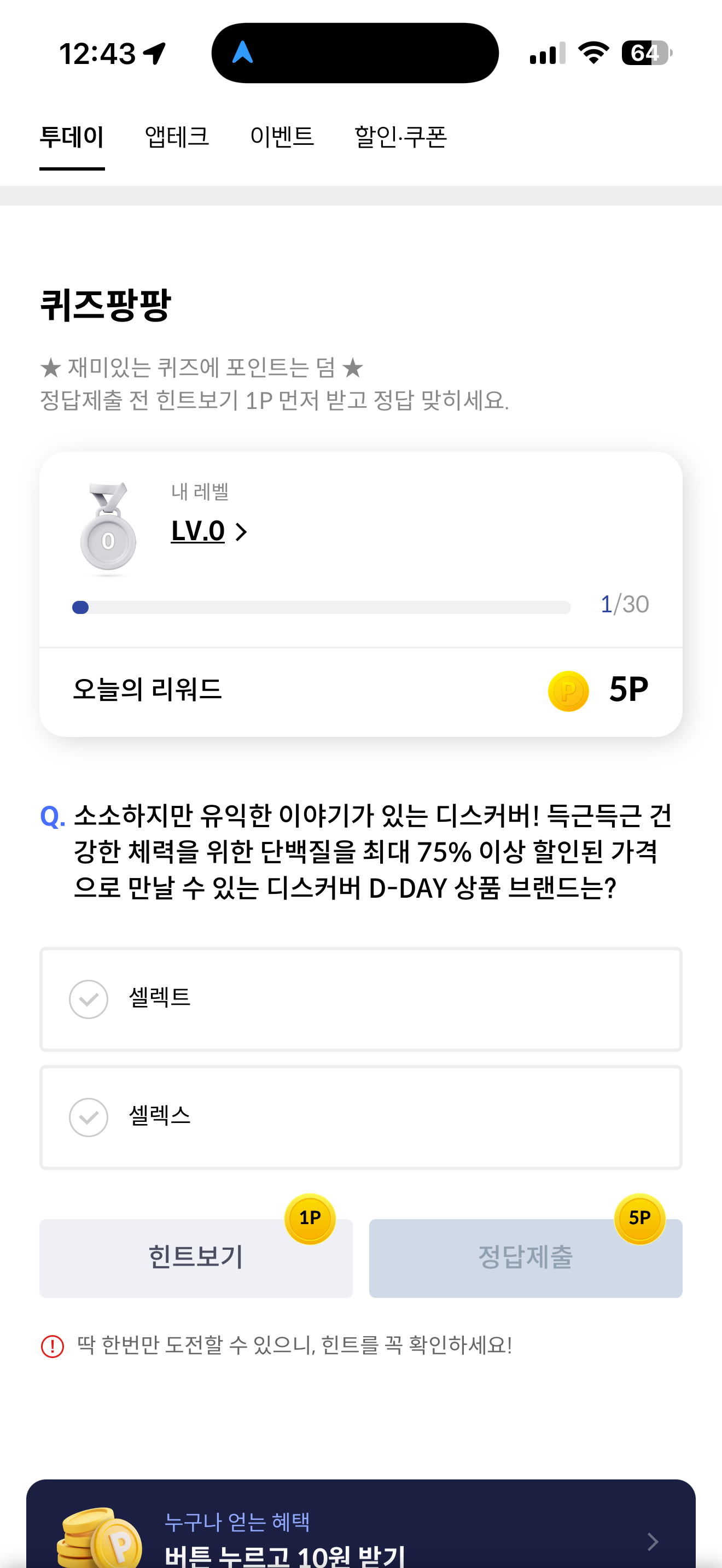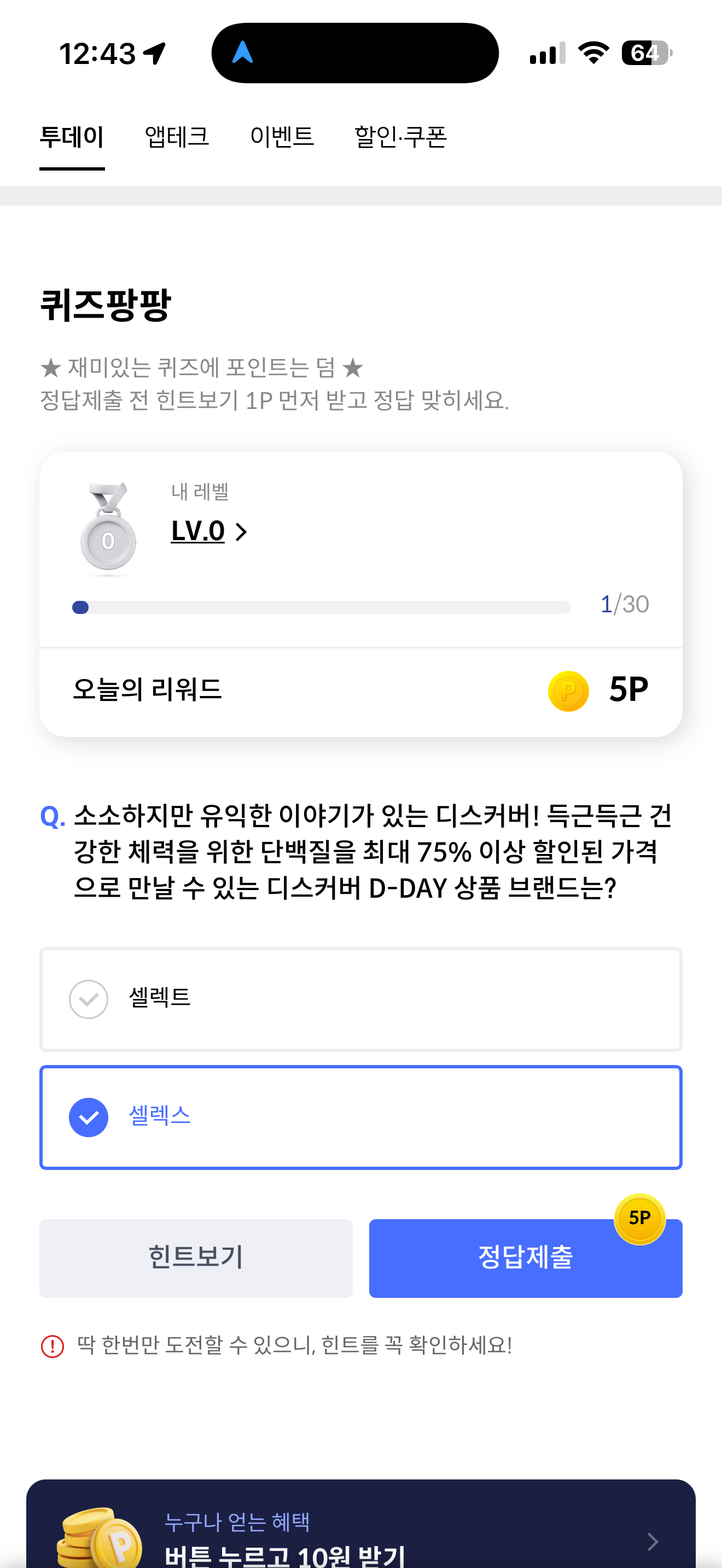 소소하지만 유익한 이야기가 있는 디스커버! 득근득근 건강한 체력을 위한 단백질을 최대 75% 이상 할인된 가격으로 만날 수 있는 디스커버 D-DAY 상품 브랜드는? 보기는 1. 셀렉트 2. 셀렉스 입니다