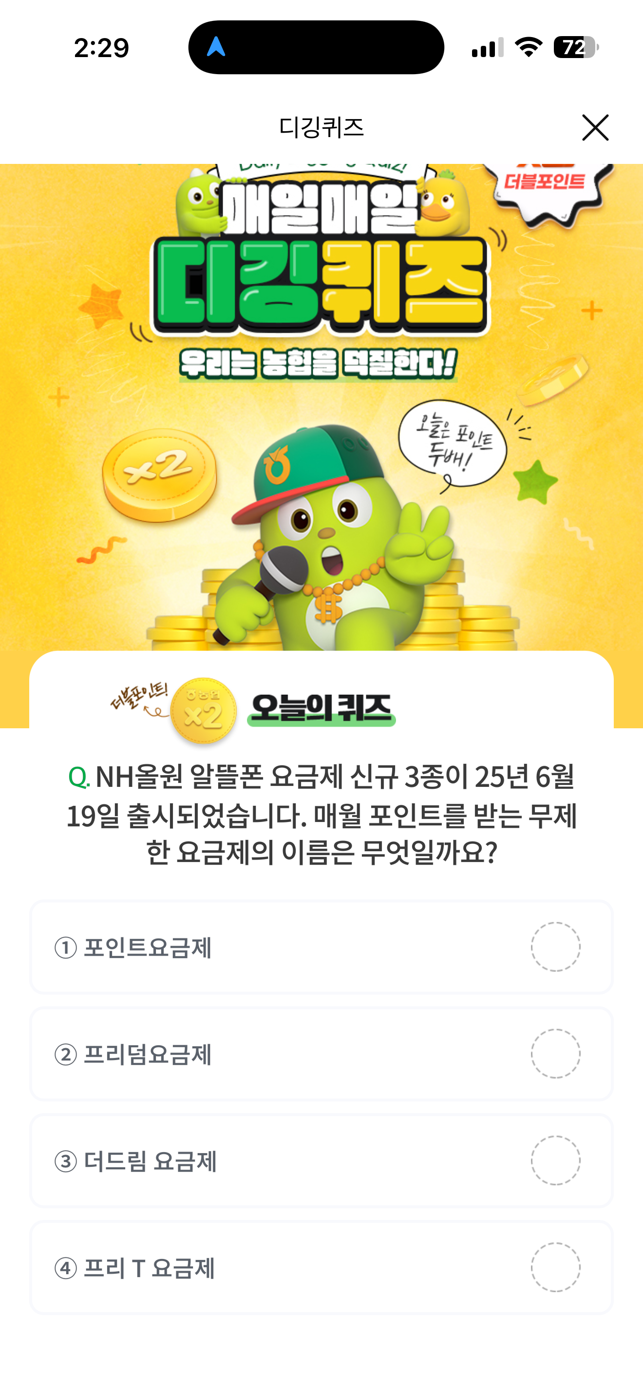 NH올원뱅크 디깅퀴즈 정답은 프리덤요금제 입니다