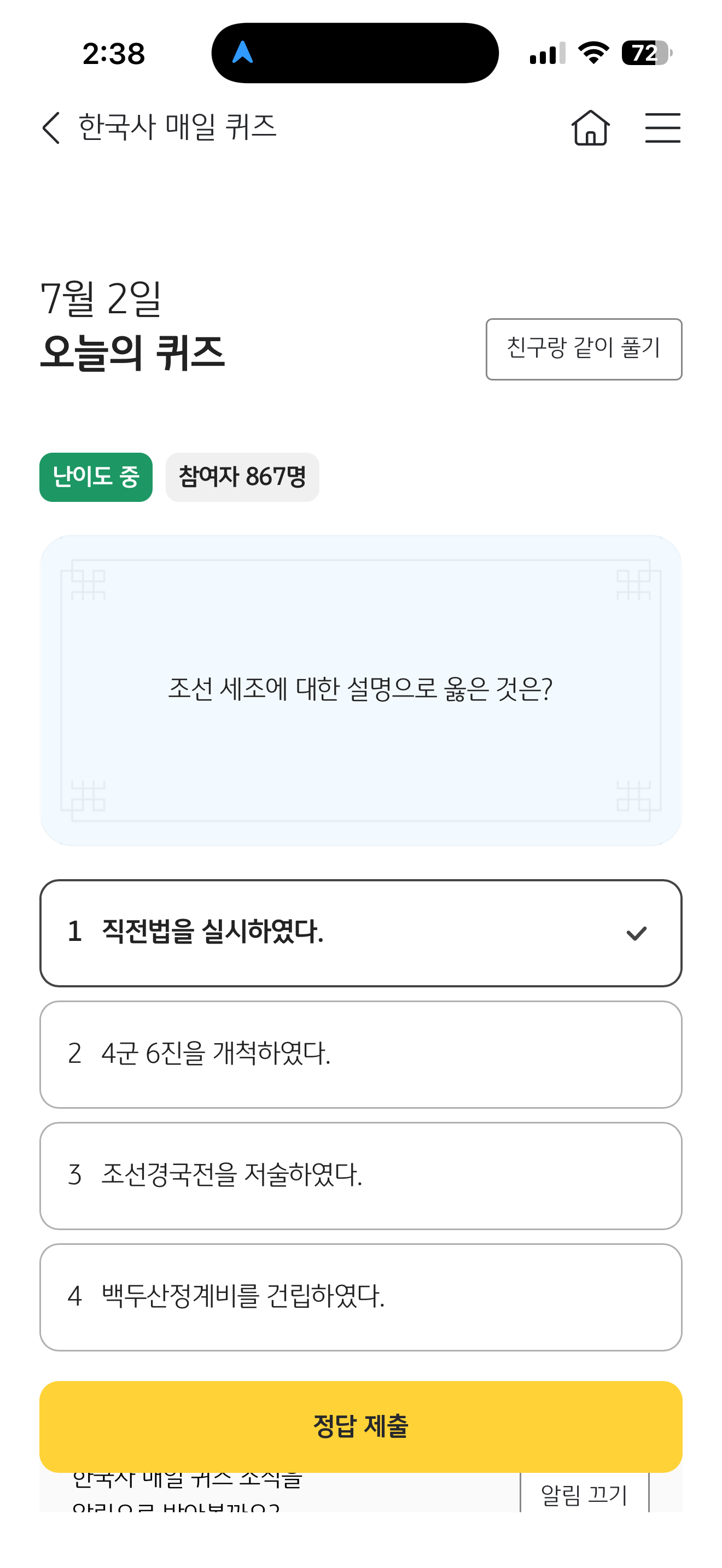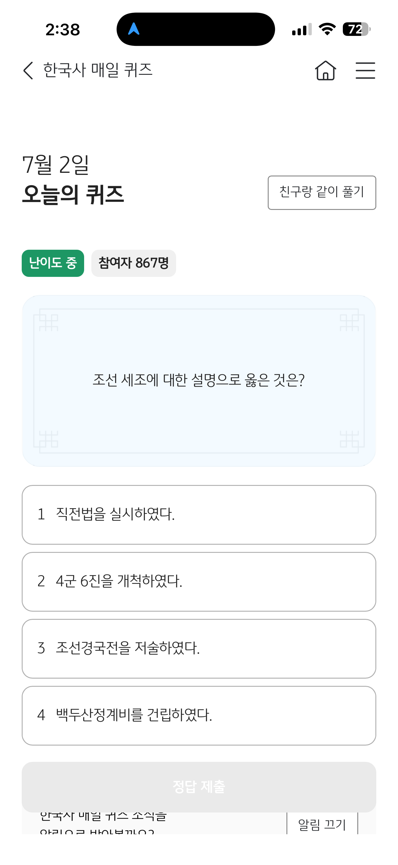 KB스타뱅킹 한국사 매일 퀴즈 7월 2일 문제입니다