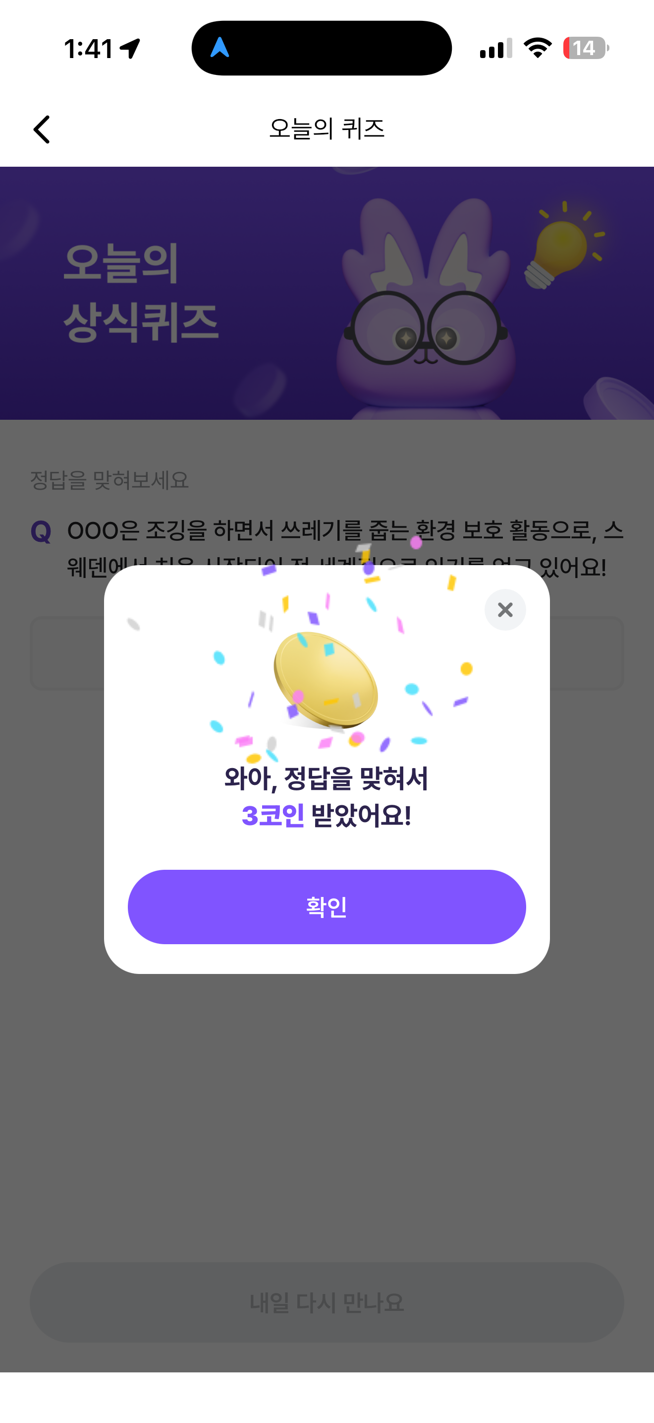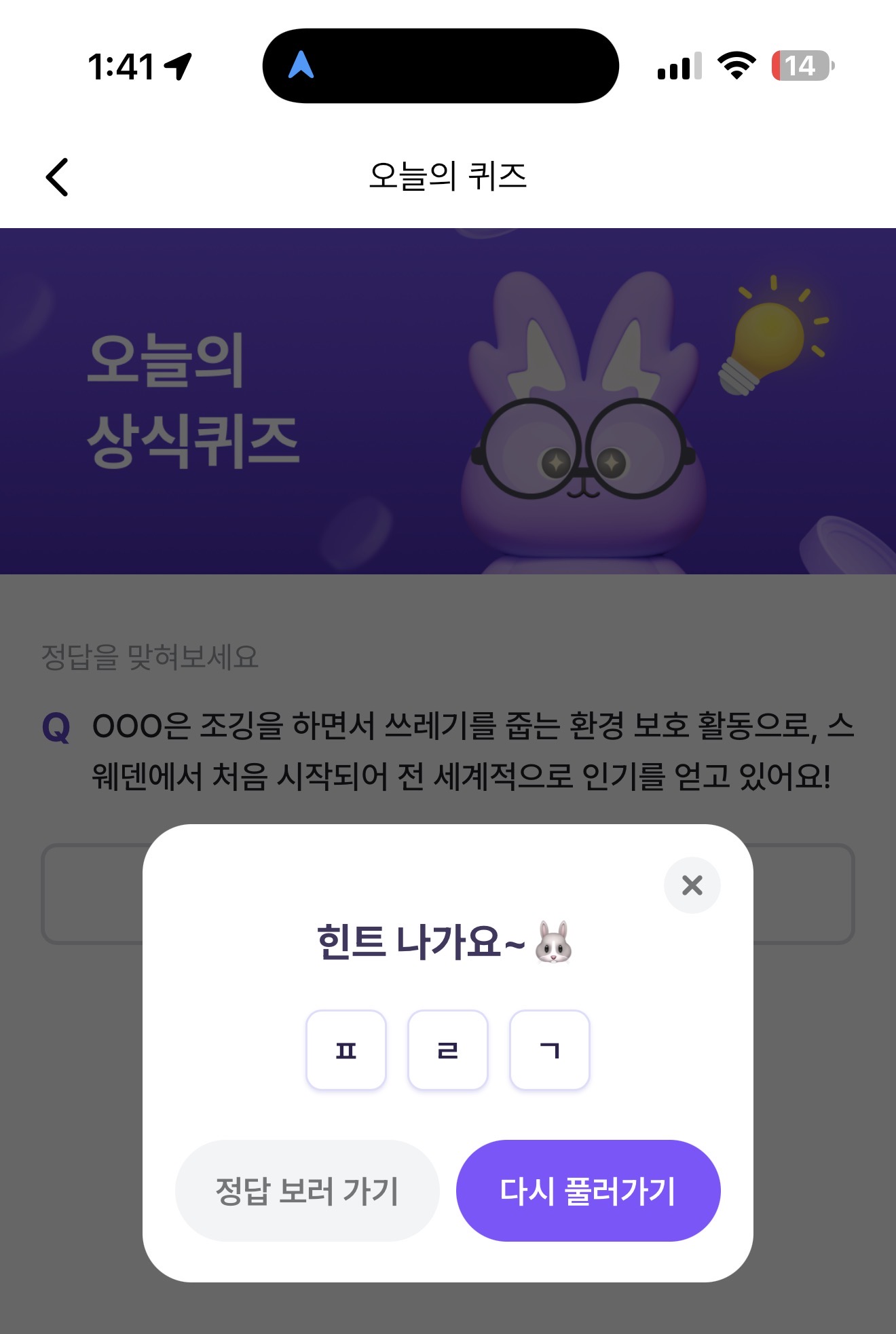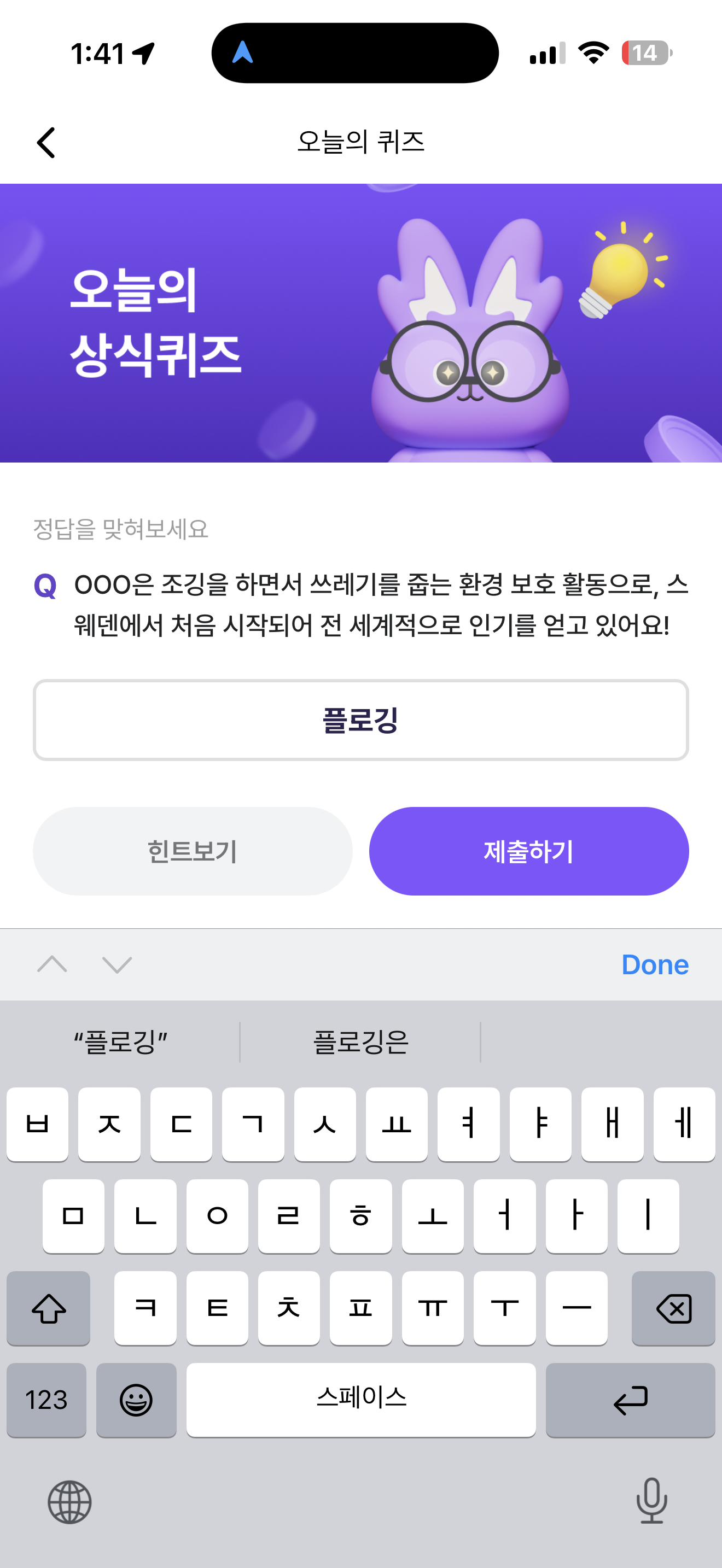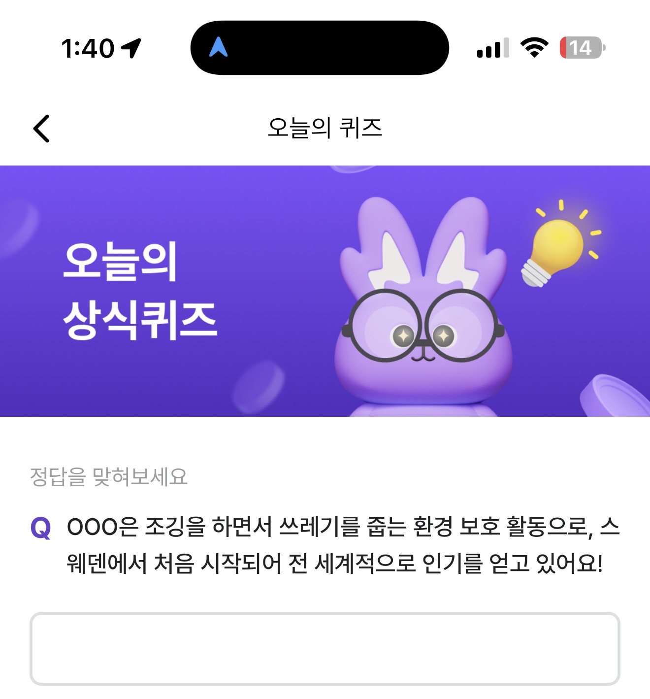 OOO은 조깅을 하면서 쓰레기를 줍는 환경 보호 활동으로, 스웨덴에서 처음 시작되어 전 세계적으로 인기를 얻고 있어요! 주관식 퀴즈인데요. 요즘 러닝이 대세죠. 조깅을 하면서 쓰레기를 줍고 환경 보호를 하는 활동이 이뤄지고 있습니다.