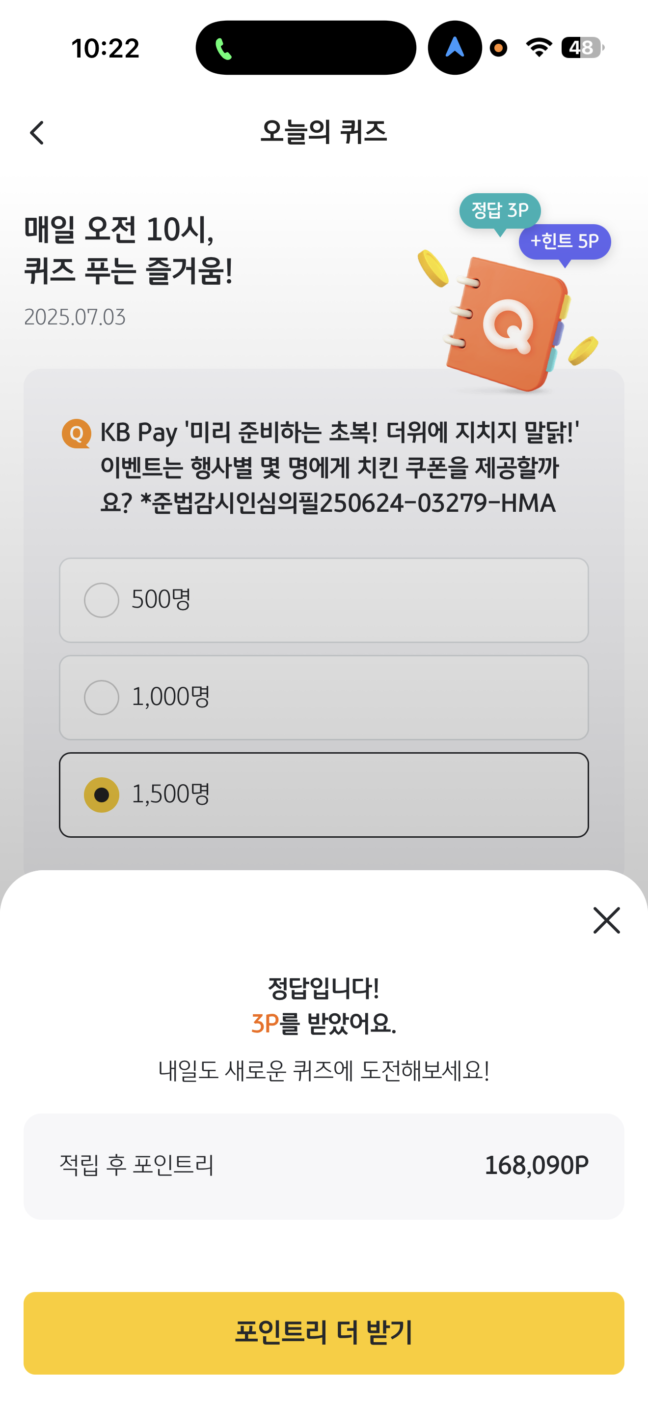 KB Pay 오늘의 퀴즈 정답은 1,500명 입니다