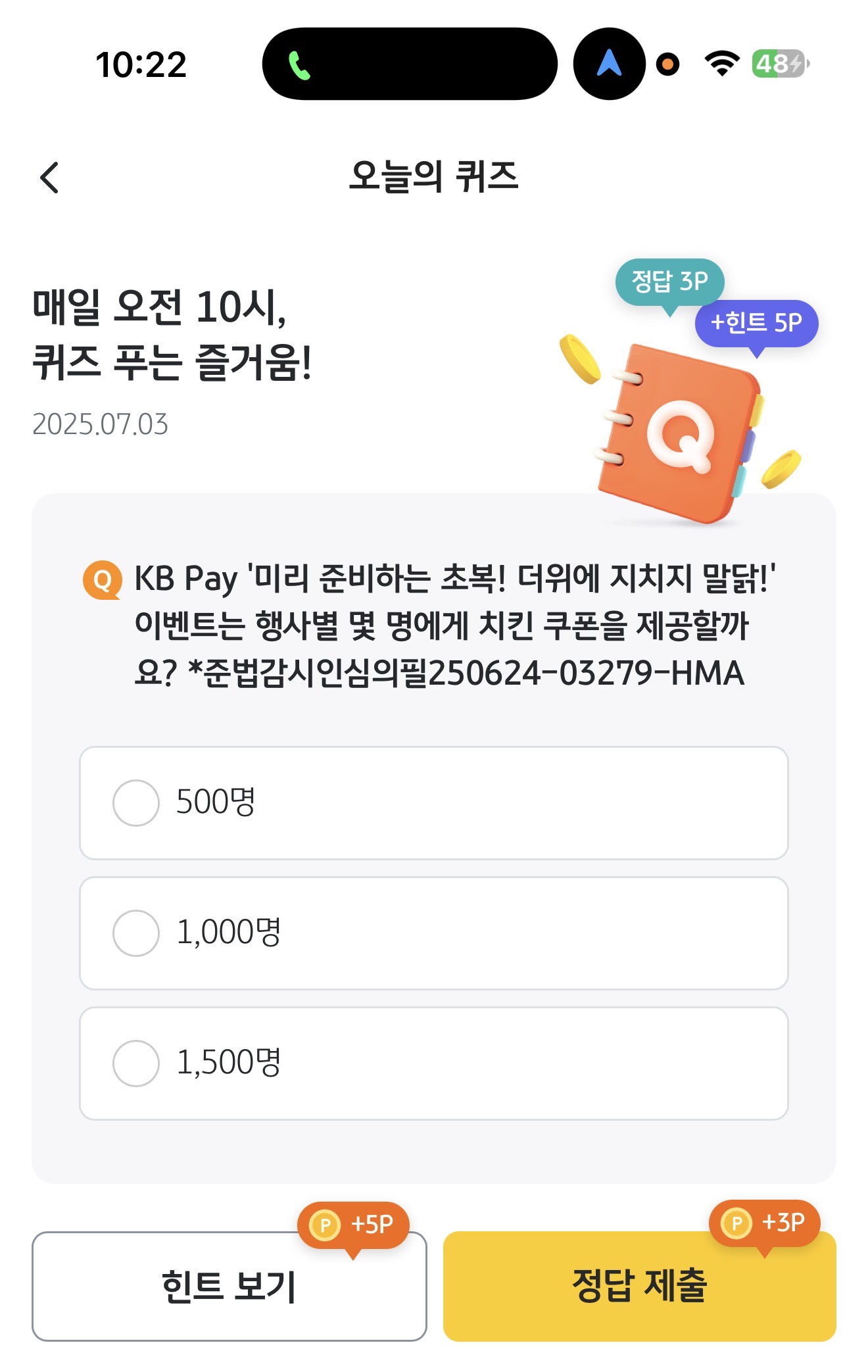 KB Pay 오늘의 퀴즈 7월 3일 정답(KB Pay '미리 준비하는 초복! 더위에 지치지 말닭!' 이벤트는 행사별 몇 명에게 치킨 쿠폰을 제공할까요?)