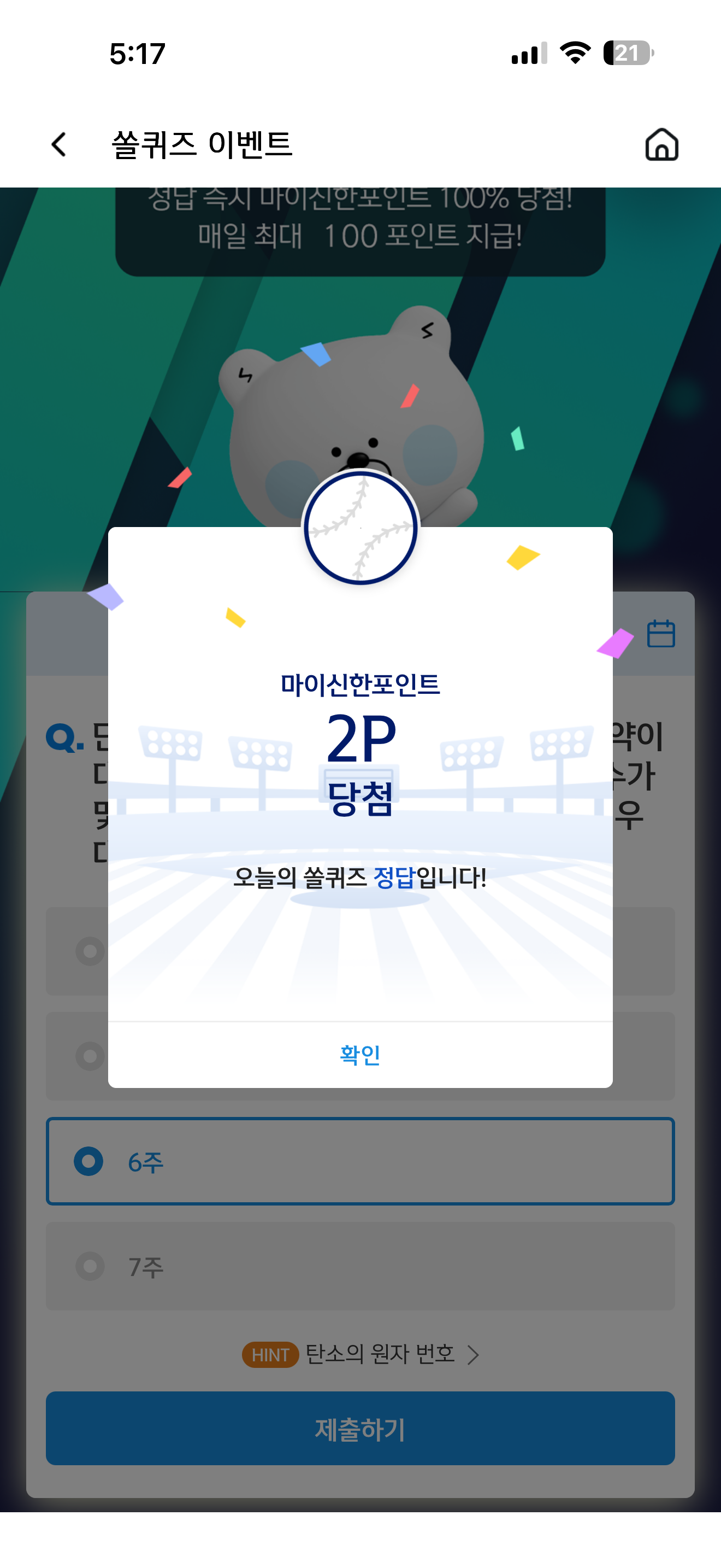 신한 슈퍼SOL 야구/상식 쏠퀴즈 정답은 6주 입니다