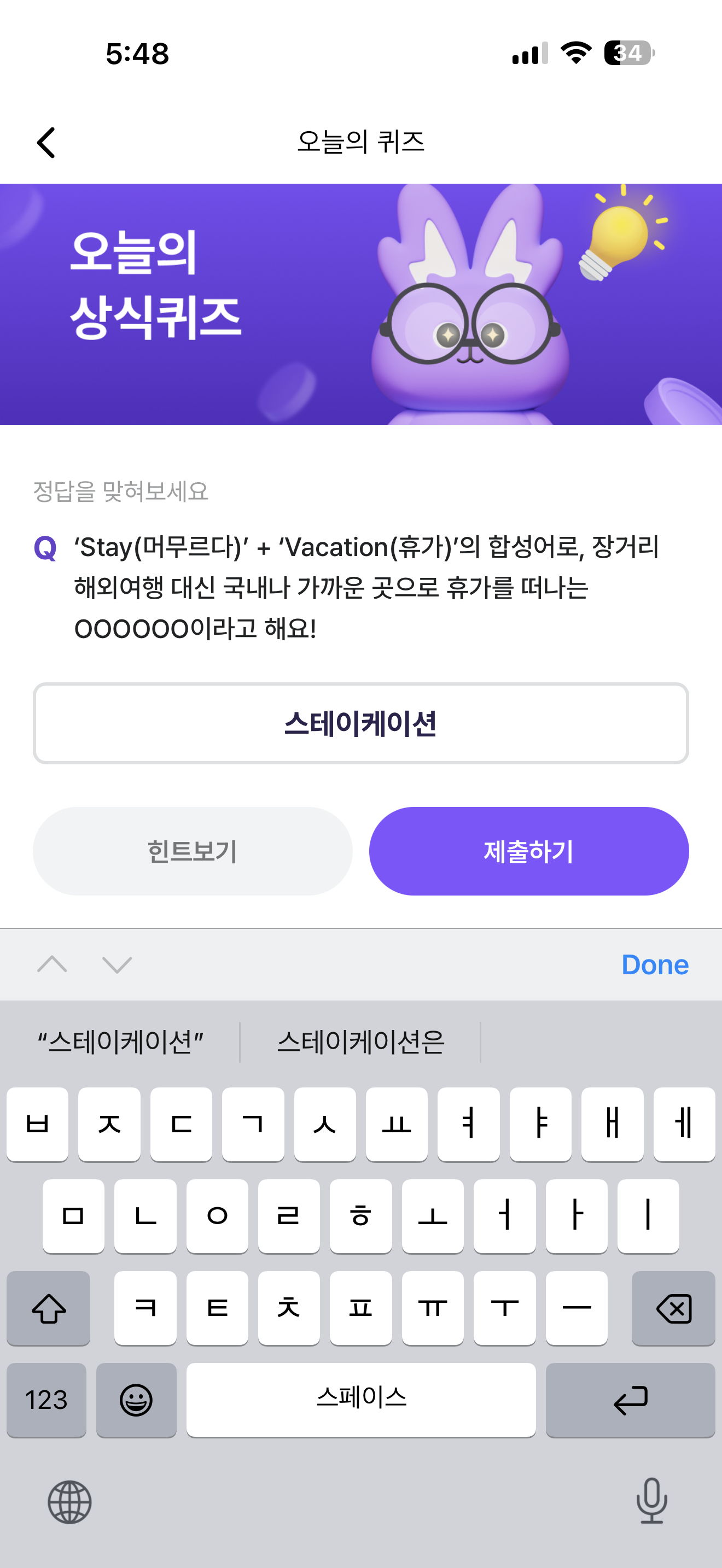 비트버니 오늘의 퀴즈 정답은 스테이케이션 입니다