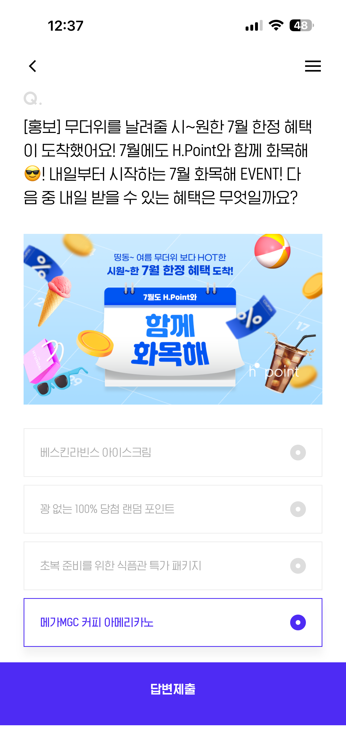 무더위를 날려줄 시~원한 7월 한정 혜택이 도착했어요! 7월에도 H.Point와 함께 화목해! 내일부터 시작하는 7월 화목해 EVENT! 다음 중 내일 받을 수 있는 혜택은 무엇일까요? 보기는 1. 베스킨라빈스 아이스크림 2. 꽝 없는 100% 당첨 랜덤 포인트 3. 초복 준비를 위한 식품관 특가 패키지 4. 메가MGC 커피 아메리카노 입니다