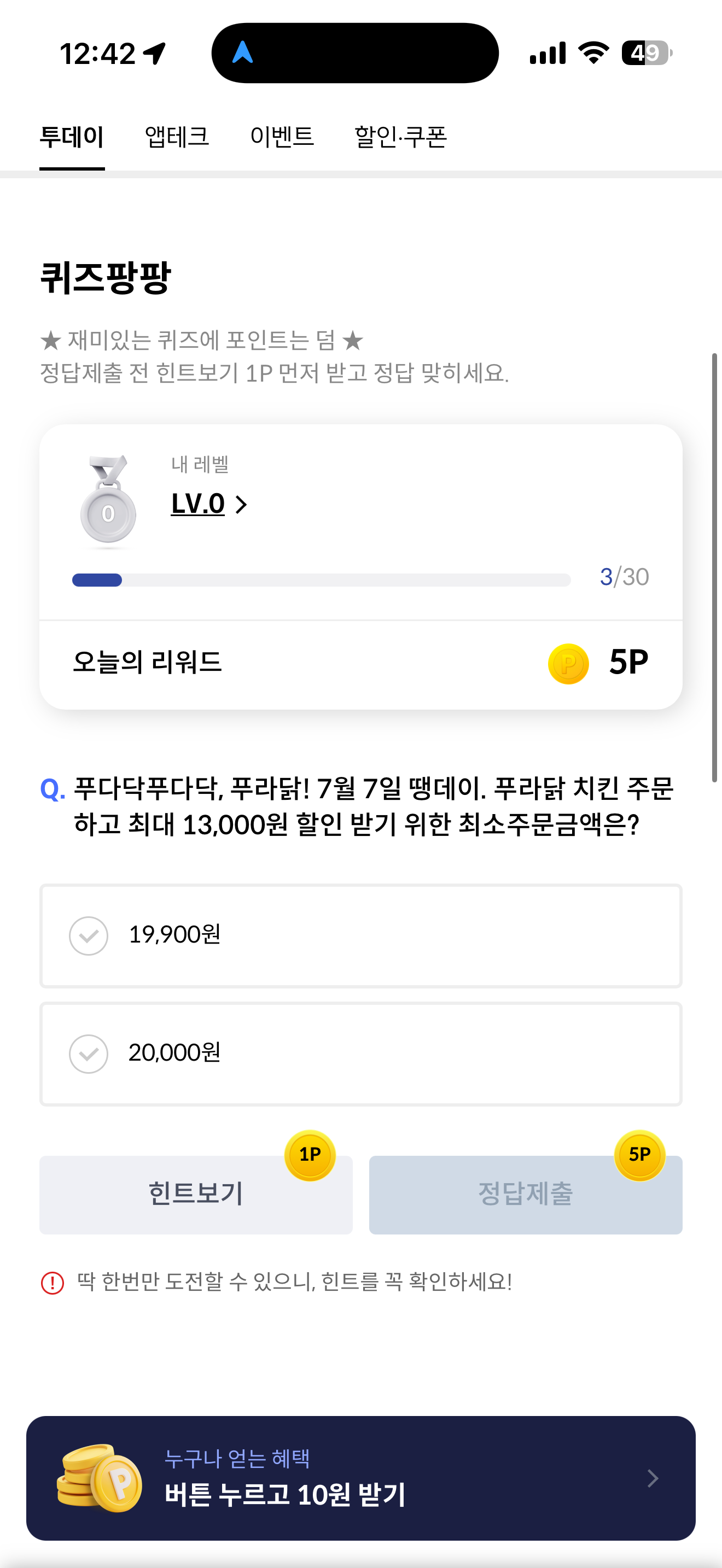 푸다닥푸다닥, 푸라닭! 7월 7일 땡데이. 푸라닭 치킨 주문하고 최대 13,000원 할인 받기 위한 최소주문금액은? 보기는 1. 19,900원 2. 20,000원 입니다. 푸라닭 치킨 할인을 받을 수 있는 파격 혜택이니 잘 참고해서 활용해 보세요
