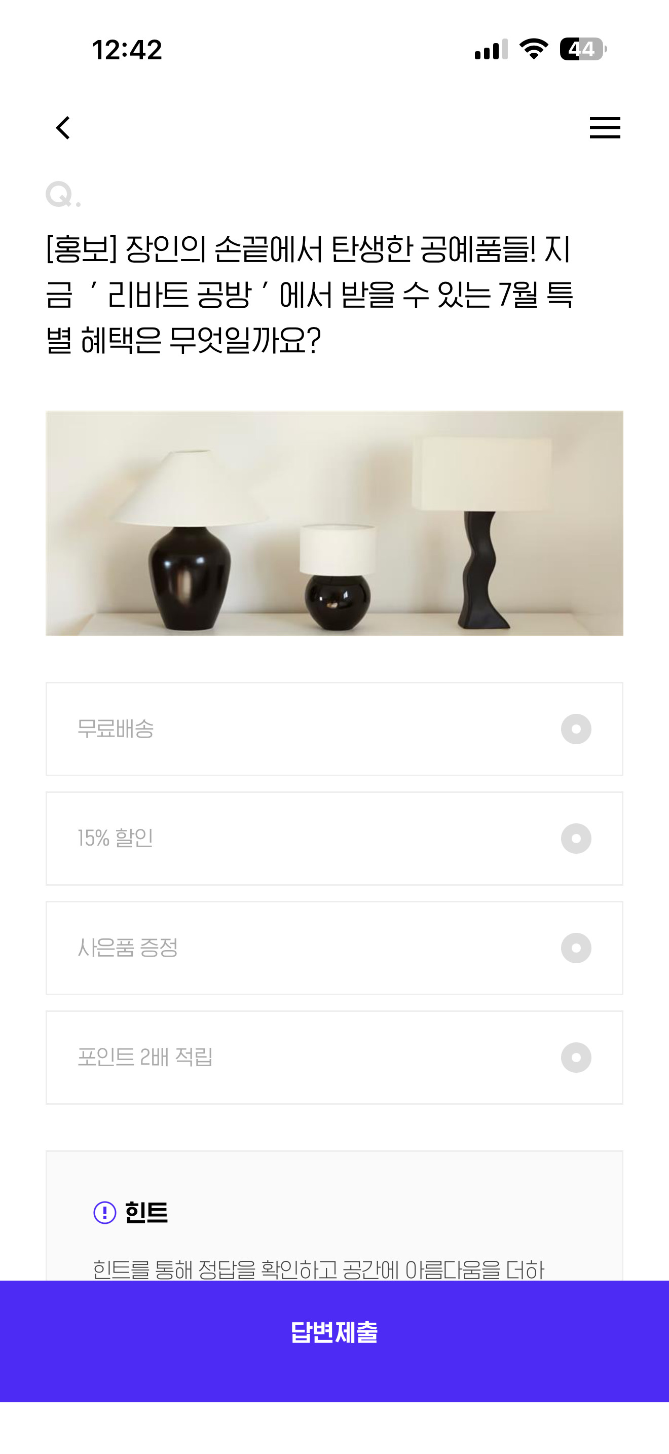 장인의 손끝에서 탄생한 공예품들! 지금 ' 리바트 공방 ' 에서 받을 수 있는 7월 특별 혜택은 무엇일까요? 보기는 1. 무료배송 2. 15% 할인 3. 사은품 증정 4. 포인트 2배 적립 입니다