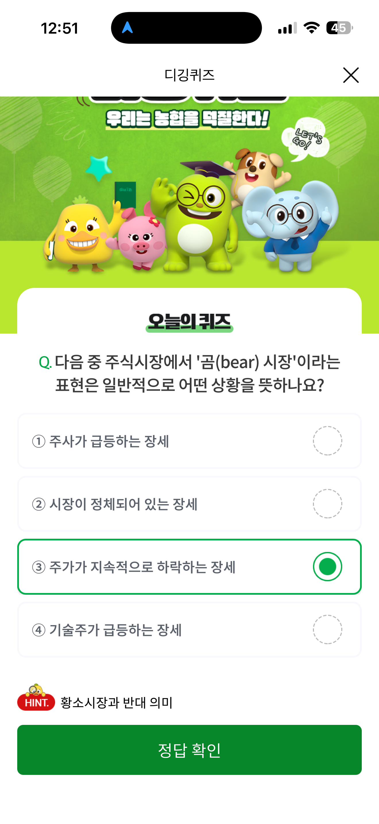 NH올원뱅크 디깅퀴즈 정답은 주가가 지속적으로 하락하는 장세 입니다