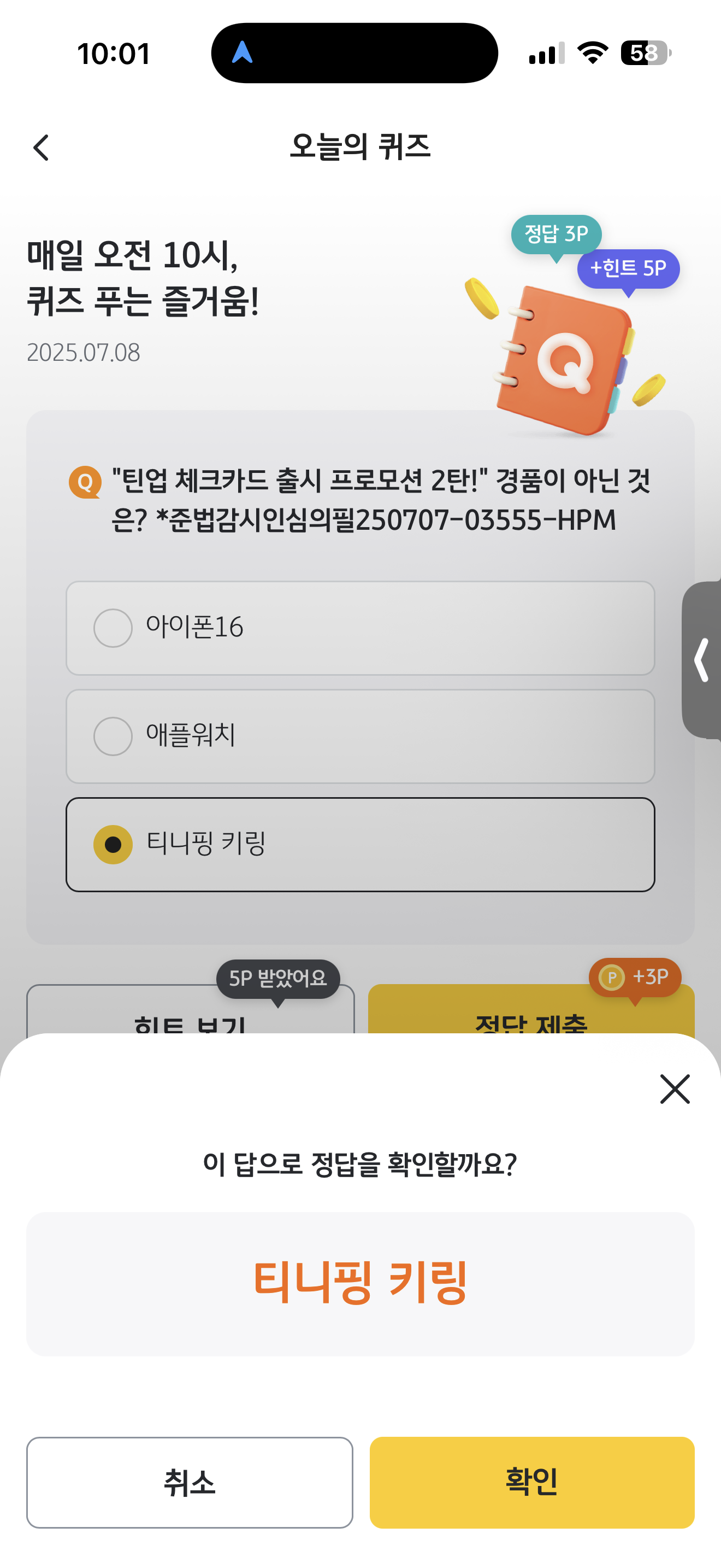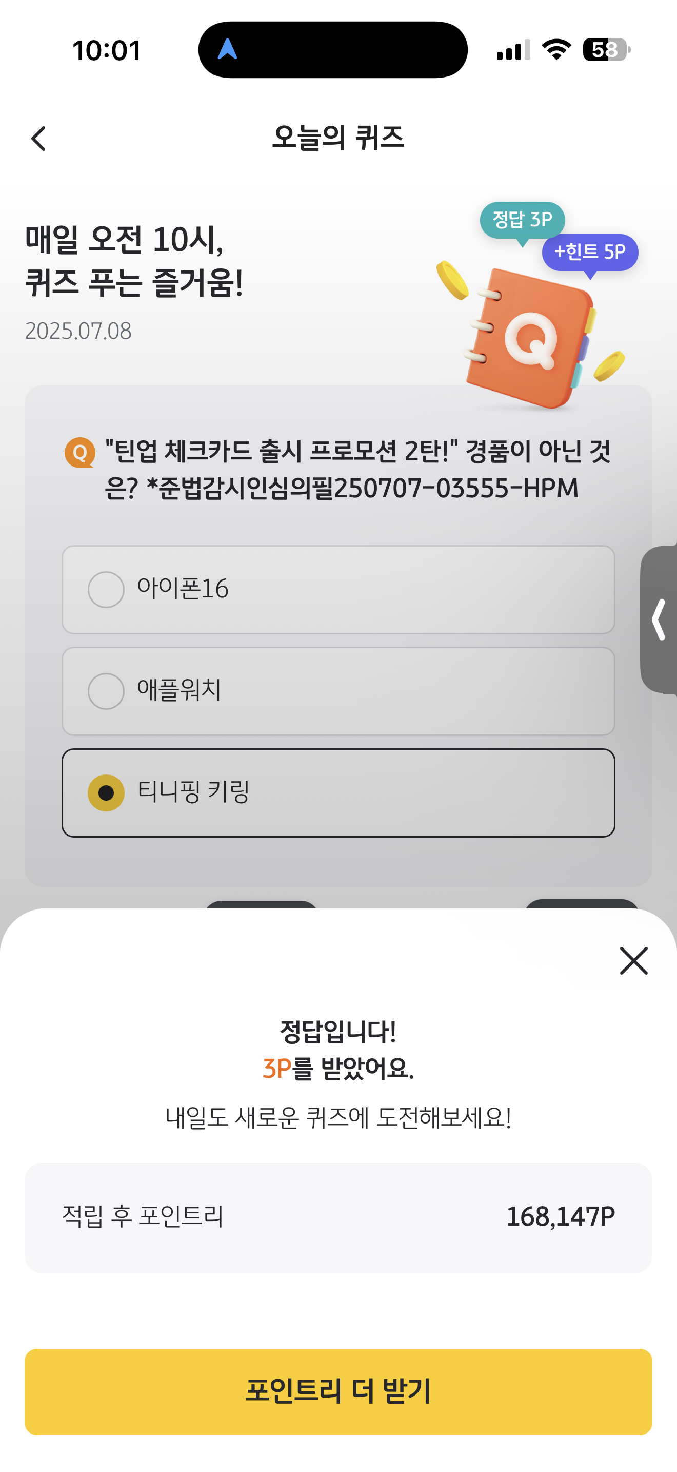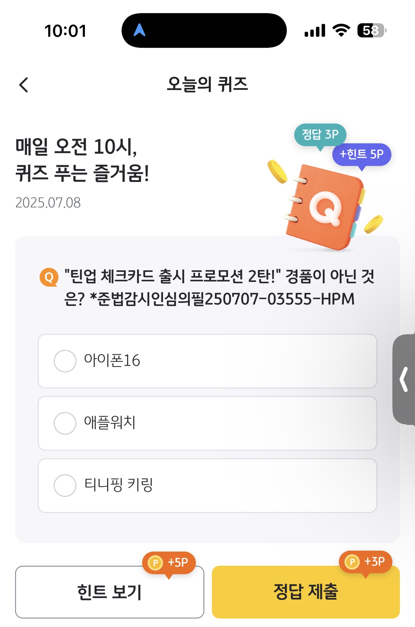 "틴업 체크카드 출시 프로모션 2탄!" 경품이 아닌 것은? *준법감시인심의필250707-03555-HPM 보기는 1. 아이폰16 2. 애플워치 3. 티니핑 키링 입니다. 틴업 체크카드 출시와 함께 푸짐한 경품이 걸려 있으니 참고해서 도전해 보세요