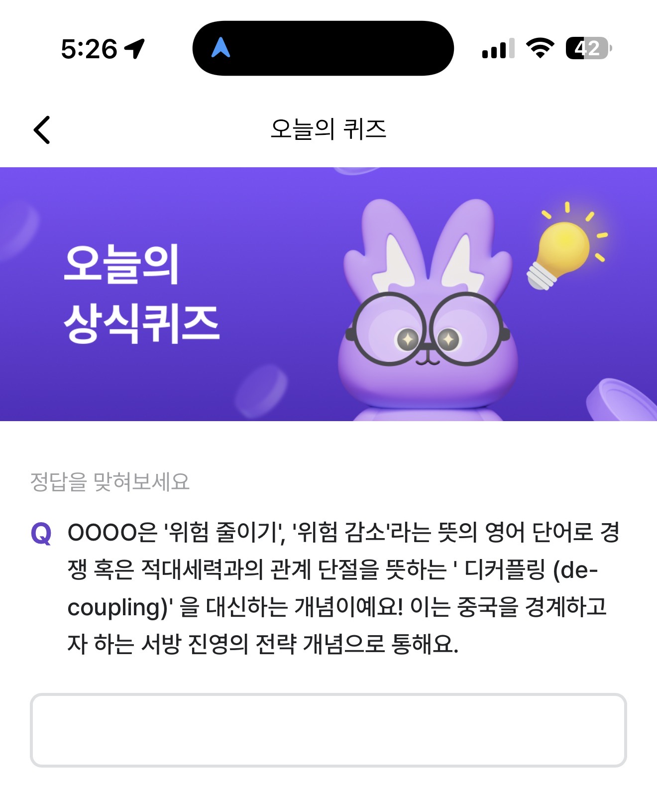 OOOO은 '위험 줄이기', '위험 감소'라는 뜻의 영어 단어로 경쟁 혹은 적대세력과의 관계 단절을 뜻하는 ' 디커플링 (de-coupling)'을 대신하는 개념이에요! 이는 중국을 경계하고자 하는 서방 진영의 전략 개념으로 통해요. 주관식 퀴즈인데요.