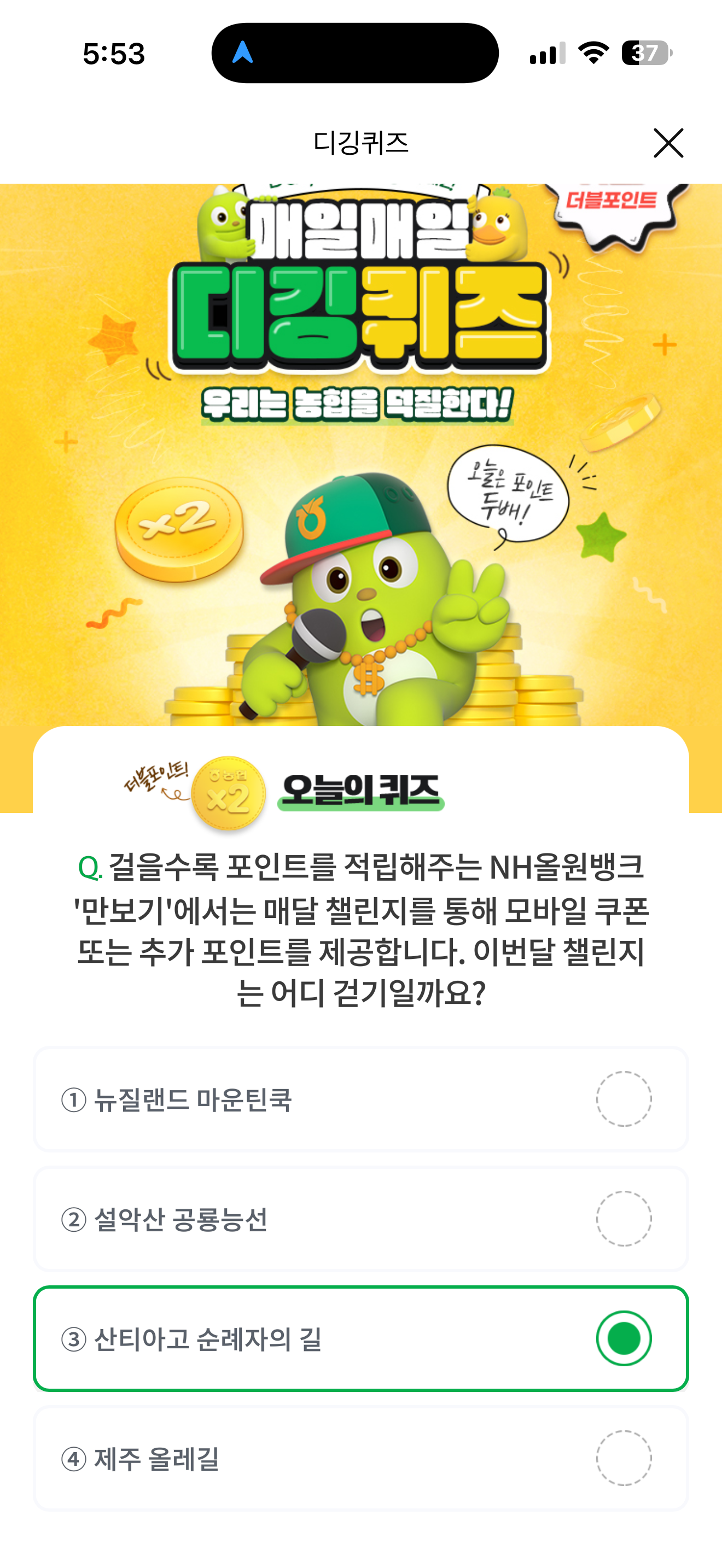 NH올원뱅크 디깅퀴즈 정답은 산티아고 순례자의 길 입니다