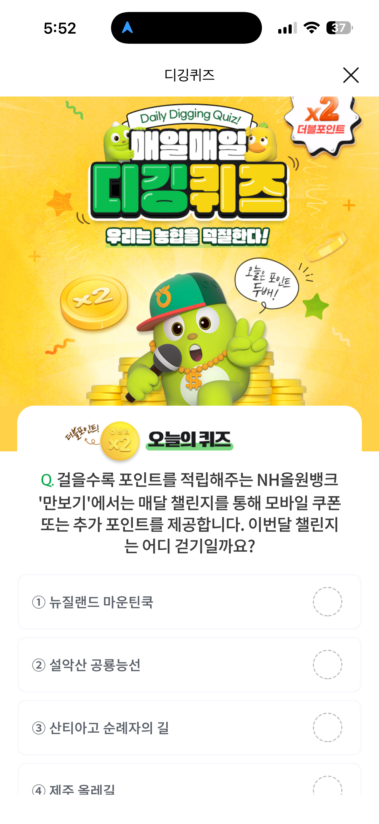 걸을수록 포인트를 적립해주는 NH올원뱅크 '만보기'에서는 매달 챌린지를 통해 모바일 쿠폰 또는 추가 포인트를 제공합니다. 이번달 챌린지는 어디 걷기일까요? 보기는 1. 뉴질랜드 마운틴쿡 2. 설악산 공룡능선 3. 산티아고 순례자의 길 4. 제주 올레길 입니다