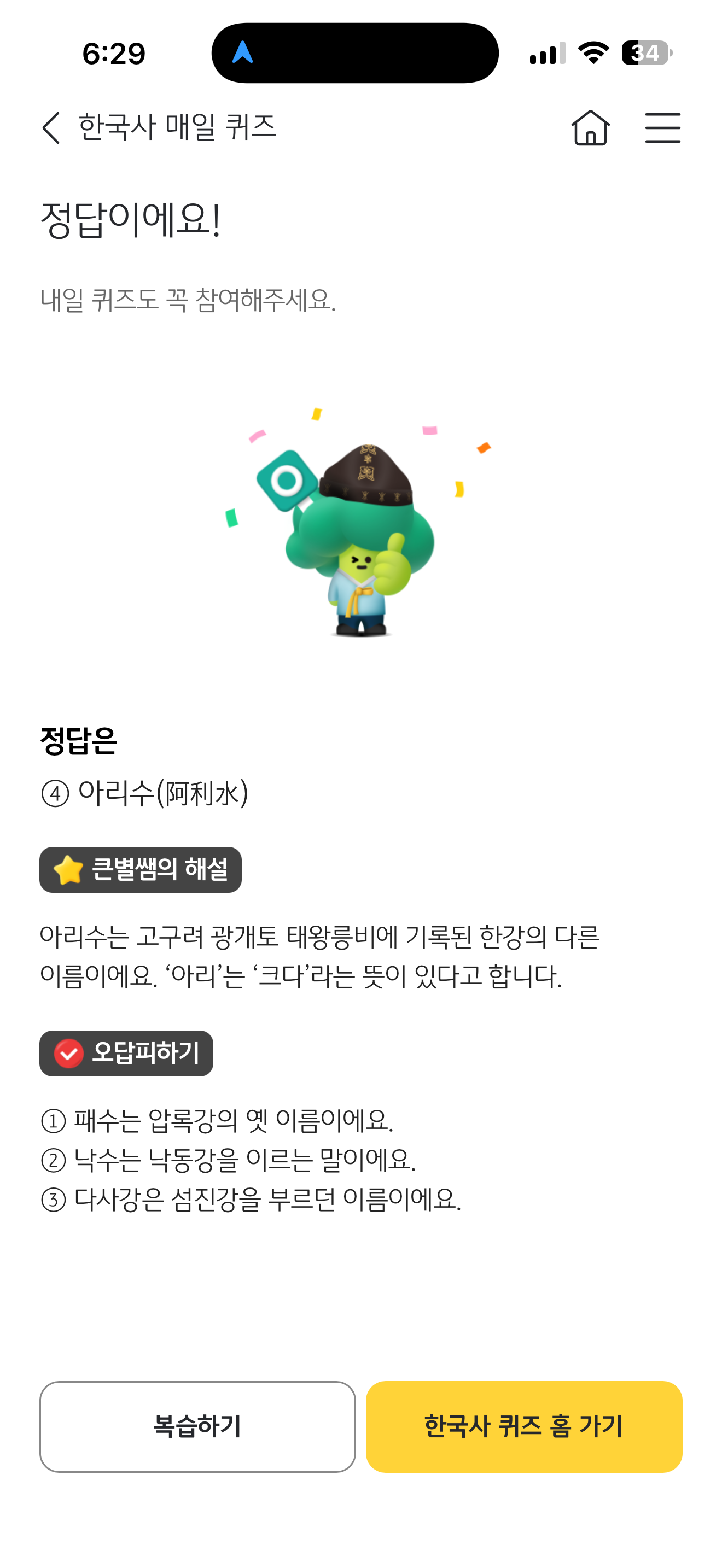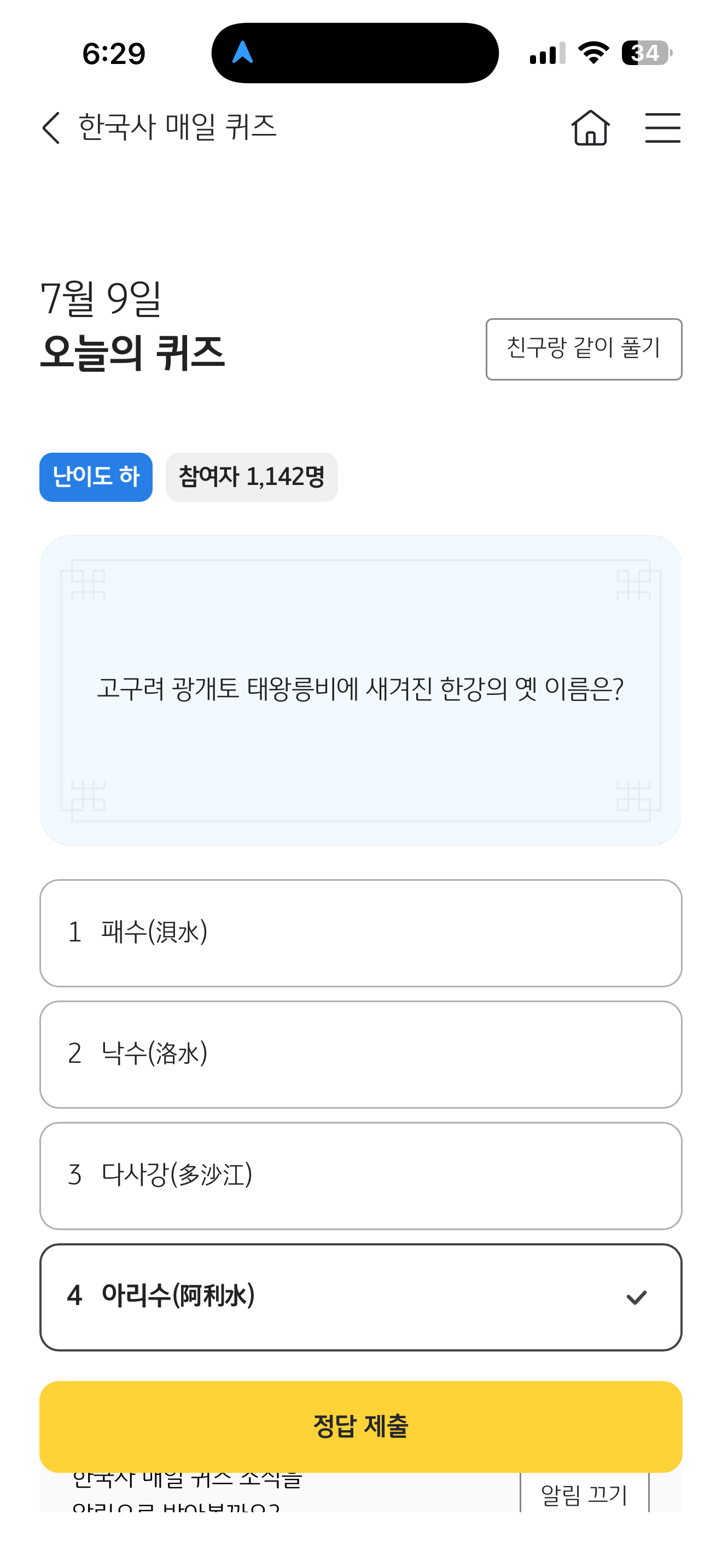 KB스타뱅킹 한국사 매일 퀴즈 정답은 아리수 입니다