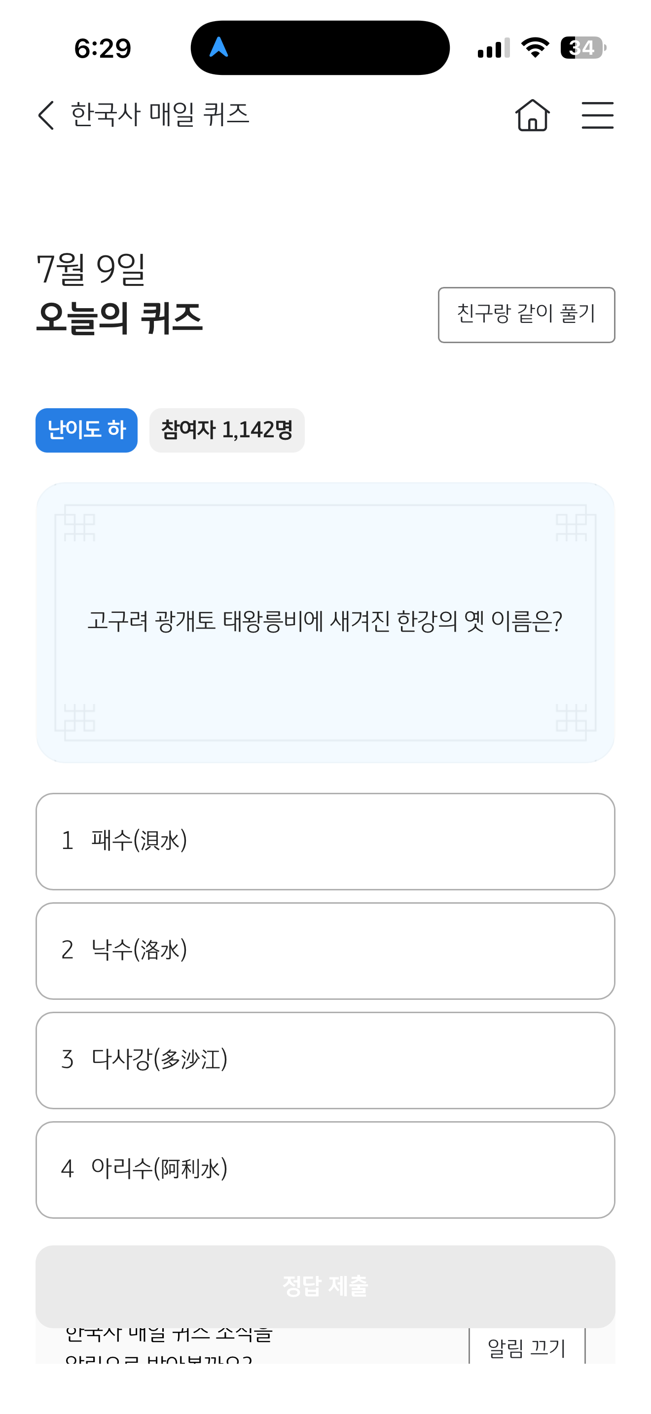 KB스타뱅킹 한국사 매일 퀴즈 정답은 아리수 입니다
