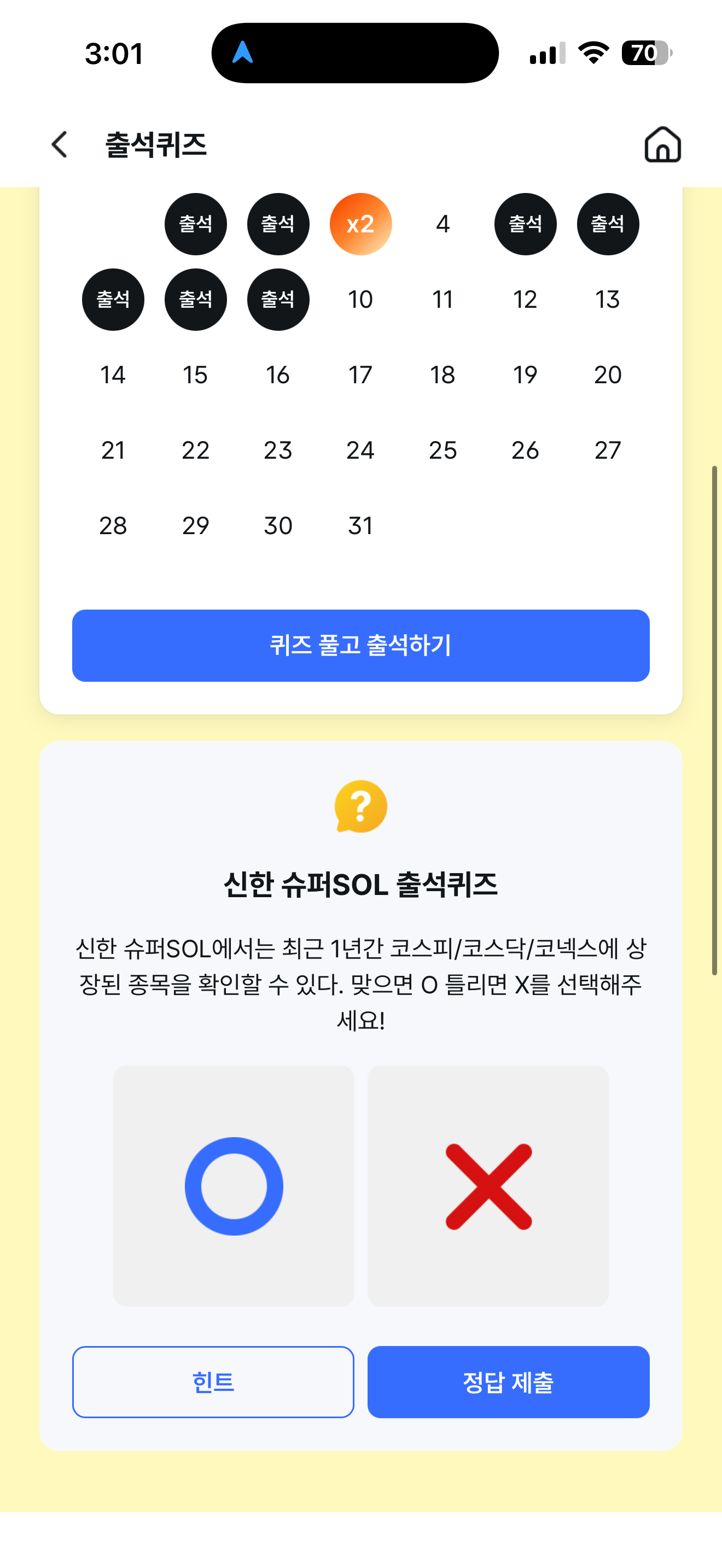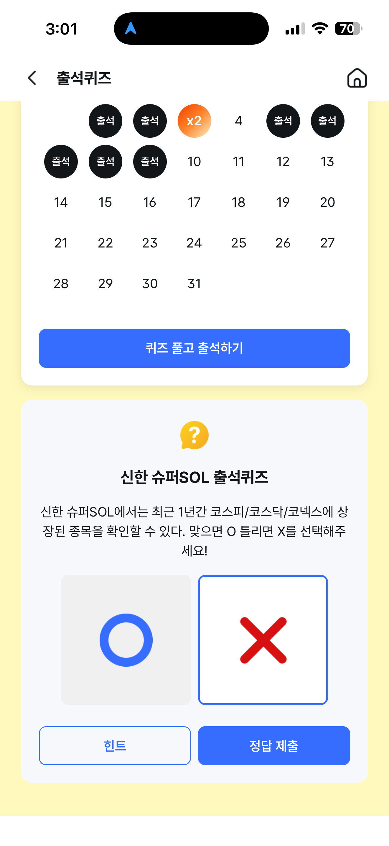 신한 슈퍼SOL 출석퀴즈 정답은 X 입니다