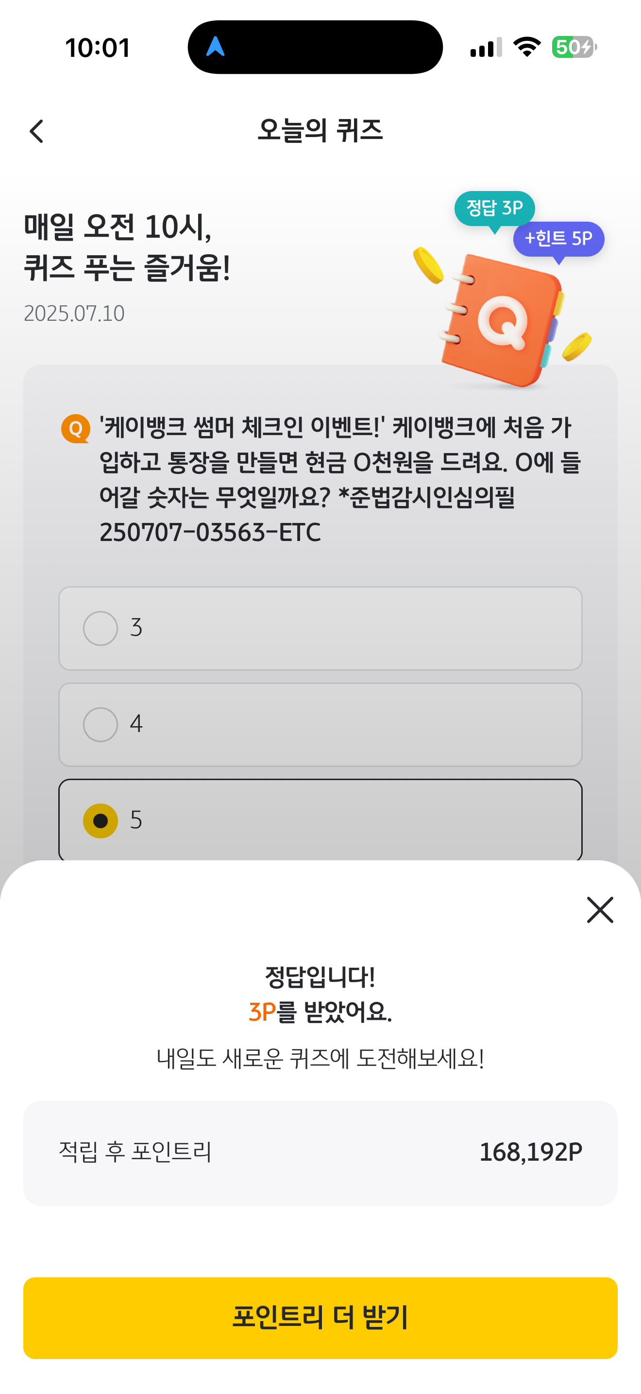 '케이뱅크 썸머 체크인 이벤트!' 케이뱅크에 처음 가입하고 통장을 만들면 현금 O천원을 드려요. O에 들어갈 숫자는 무엇일까요? *준법감시인심의필 250707-03563-ETC 보기는 1. 3 2. 4 3. 5 입니다.