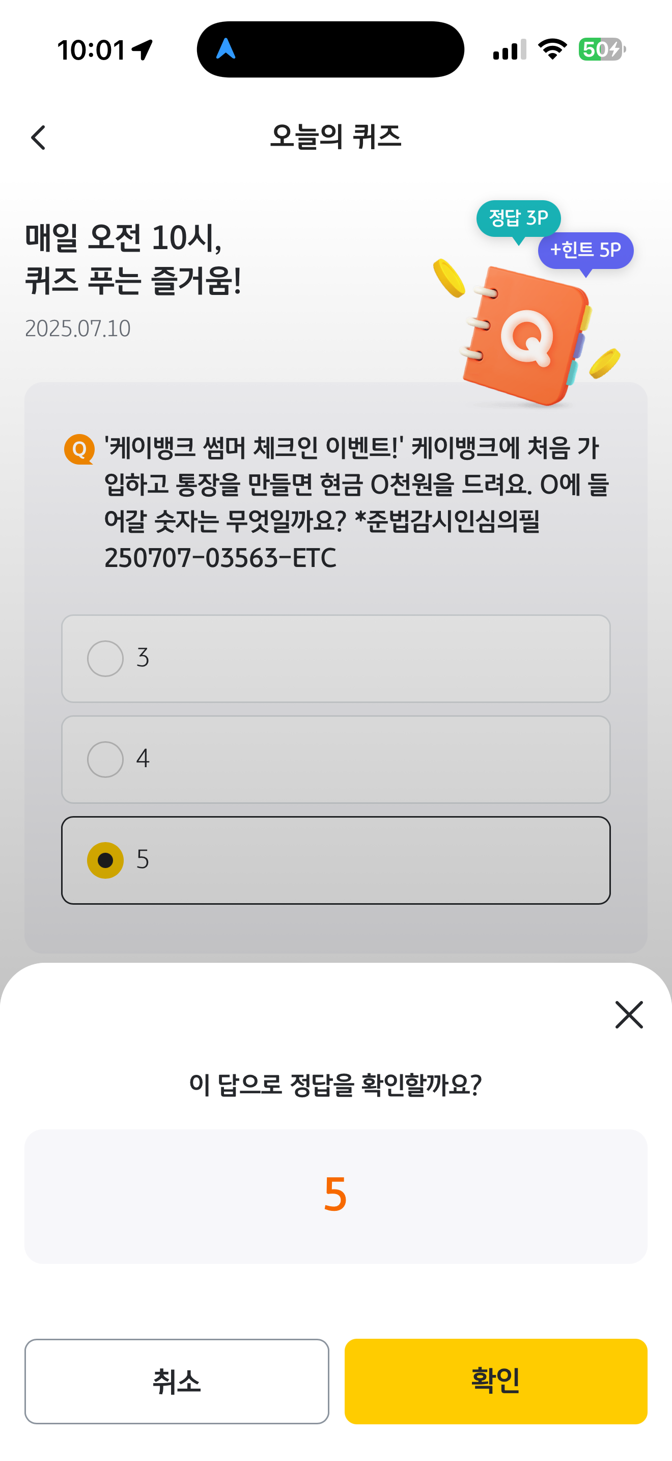 KB pay 오늘의 퀴즈 정답은 5 입니다