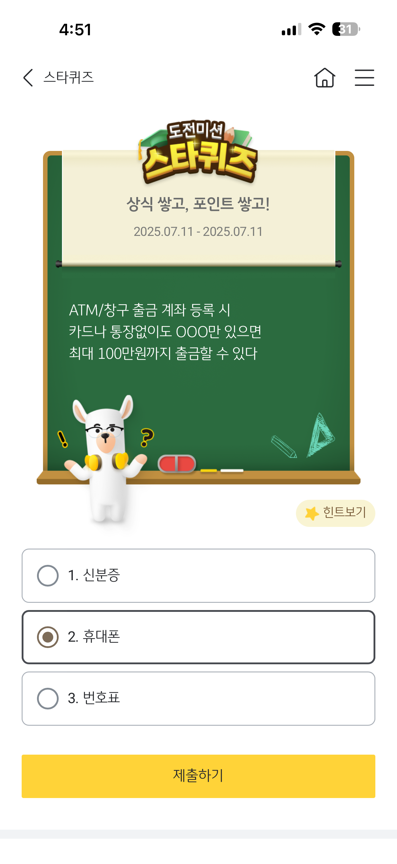 KB스타뱅킹 스타퀴즈 정답은 휴대폰 입니다
