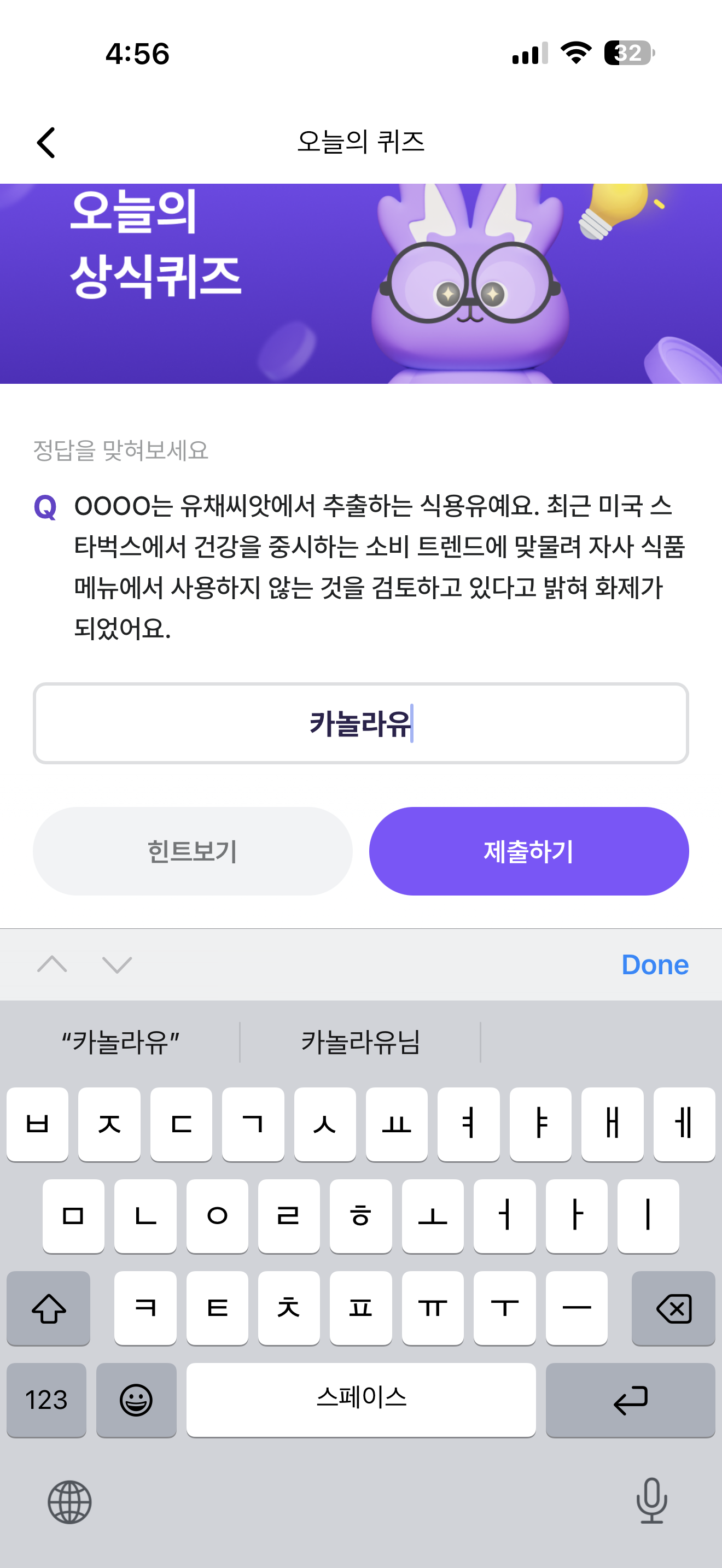 비트버니 오늘의 퀴즈 초성 힌트는 ㅋㄴㄹㅇ 입니다