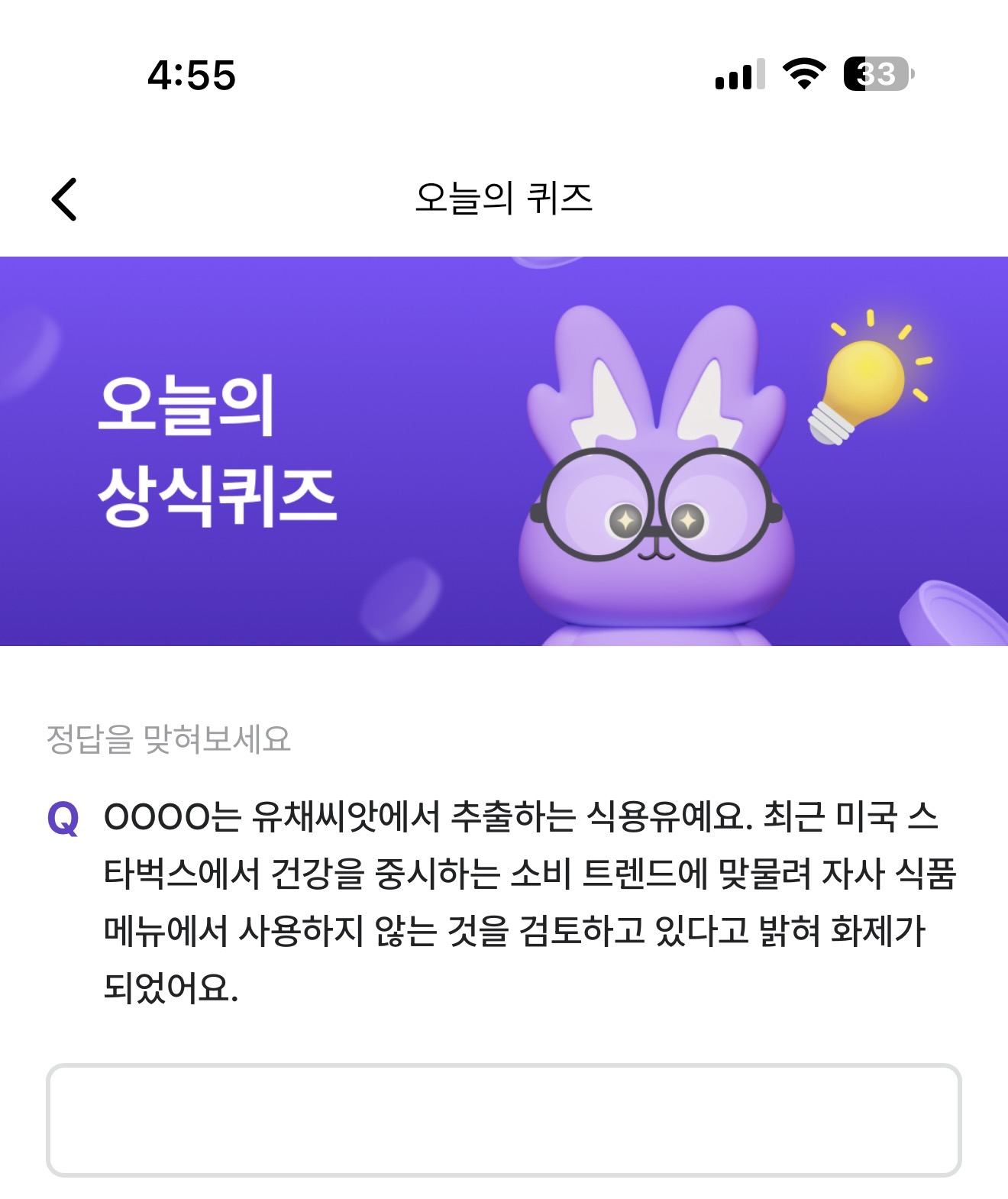 OOOO는 유채씨앗에서 추출하는 식용유예요. 최근 미국 스타벅스에서 건강을 중시하는 소비 트랜드에 맞물려 자사 식품 메뉴에서 사용하지 않는 것을 검토하고 있다고 밝혀 화제가 되었어요. 주관식 퀴즈인데요..
