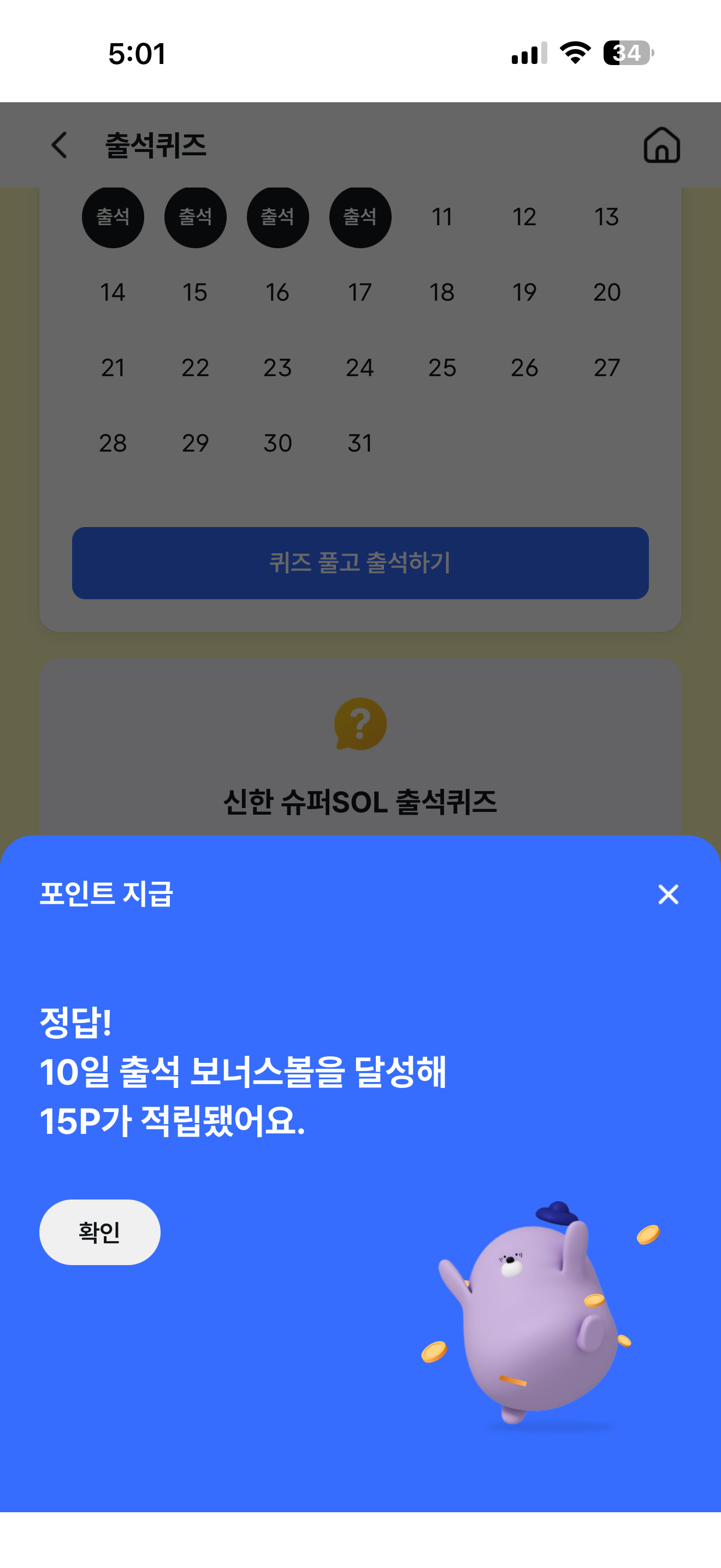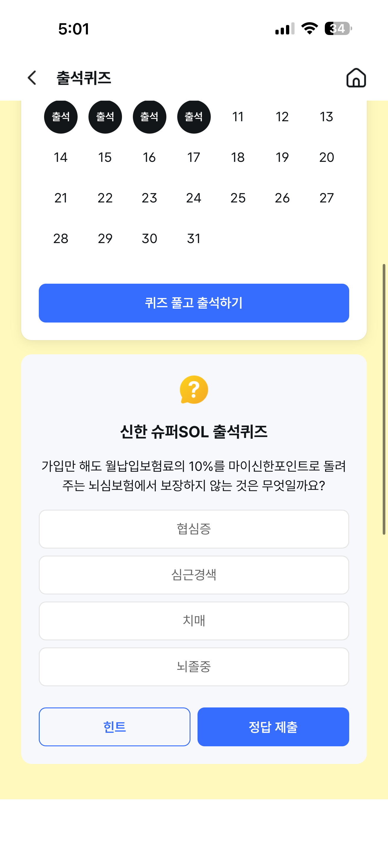신한 슈퍼SOL 출석퀴즈 정답은 치매 입니다