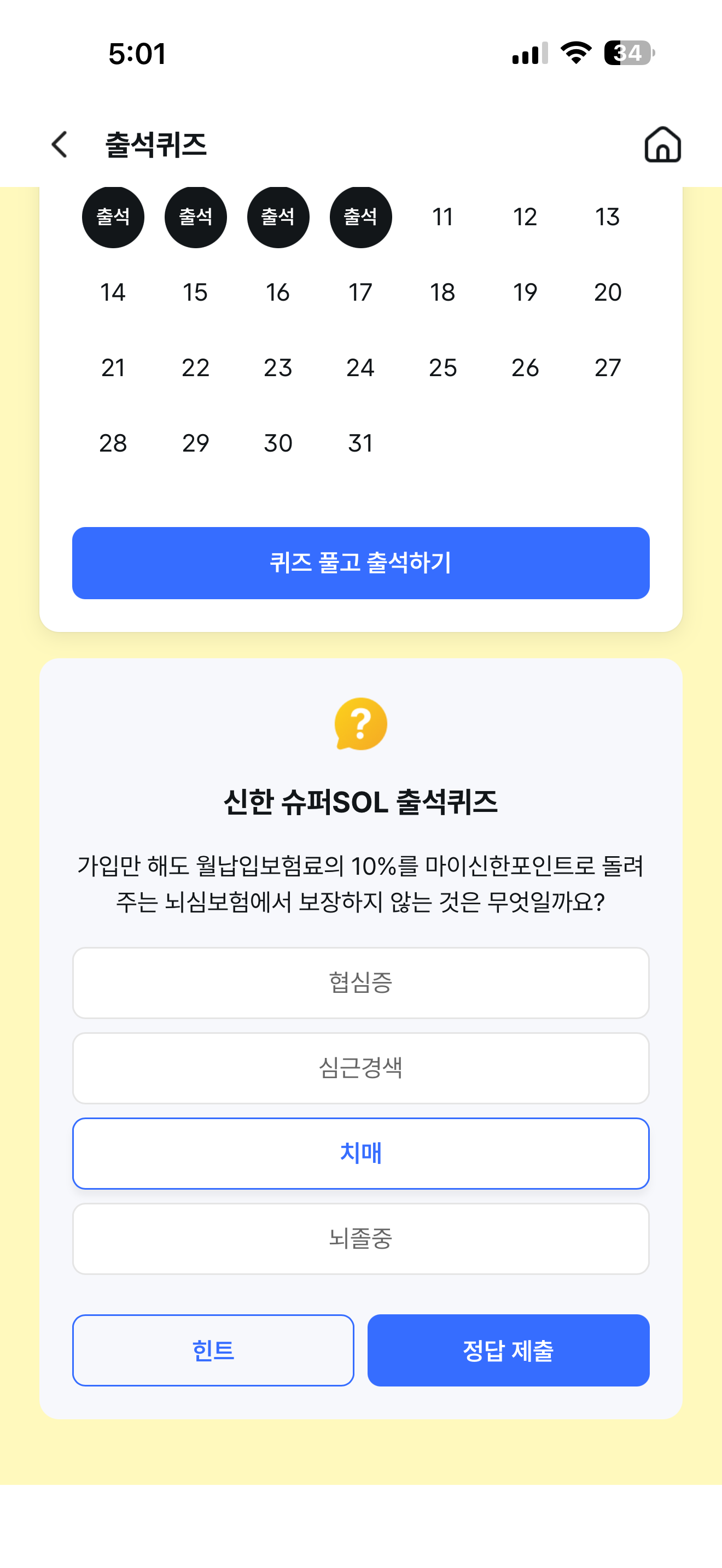 신한 슈퍼SOL 출석퀴즈 정답은 치매 입니다