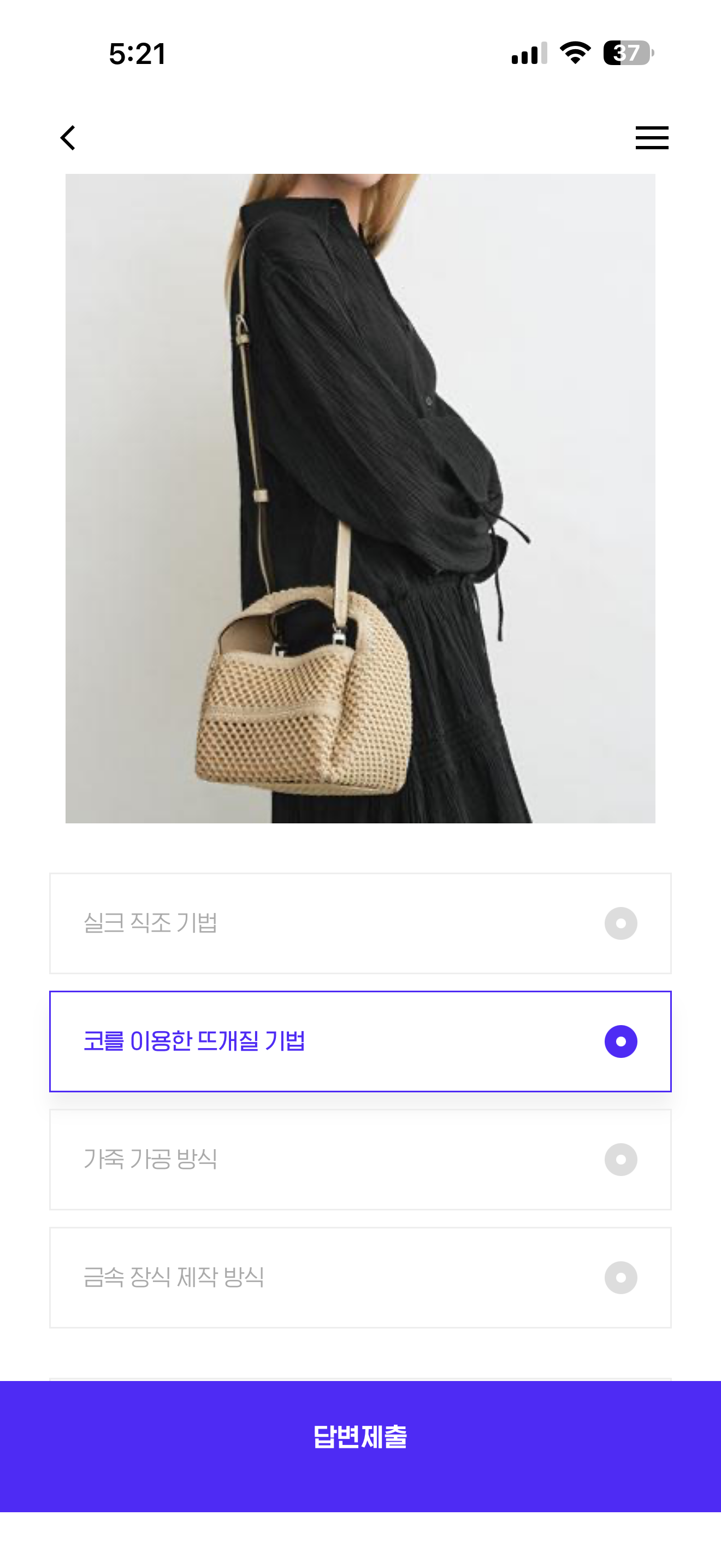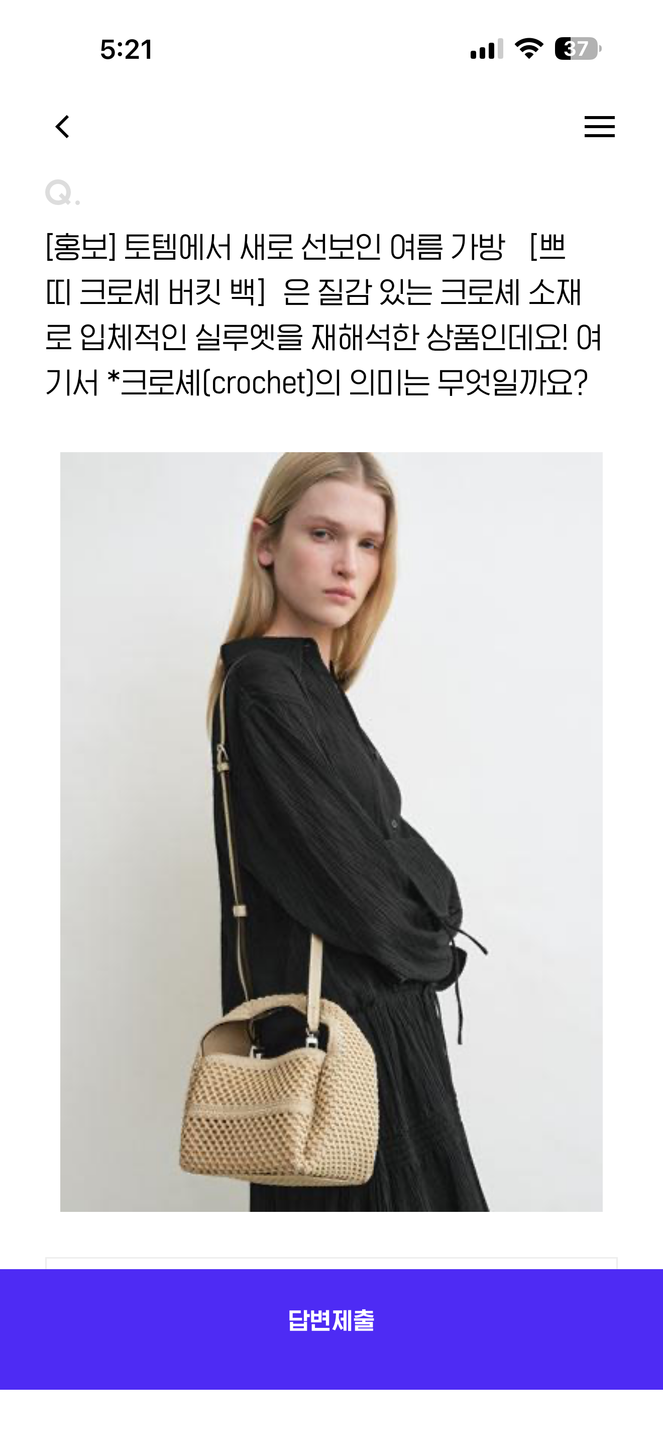 토템에서 새로 선보인 여름 가방 [쁘띠 크로셰 버킷 백] 은 질감 있는 크로셰 소재로 입체적인 실루엣을 재해석한 상품인데요! 여기서 *크로셰(crochet)의 의미는 무엇일까요? 보기는 1. 실크 직조 기법 2. 코를 이용한 뜨개질 기법 3. 가죽 가공 방식 4. 금속 장식 제작 방식
