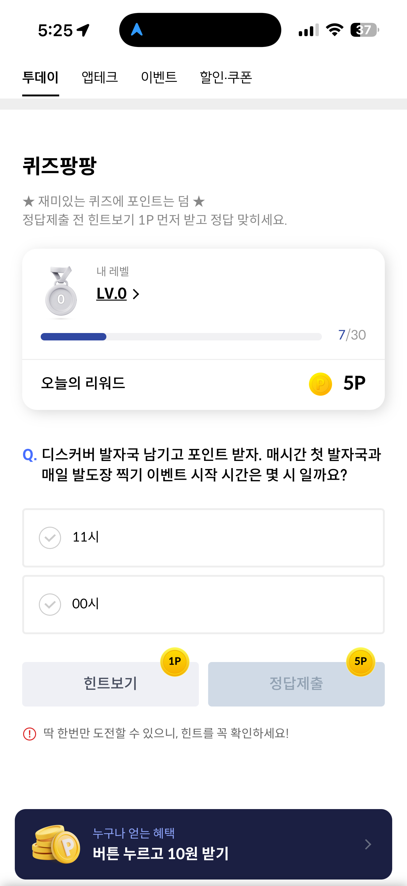 디스커버 발자국 남기고 포인트 받자. 매시간 첫 발자국과 매일 발도장 찍기 이벤트 시작 시간은 몇 시 일까요? 보기는 1. 11시 2. 00시 입니다. 디스커버 발자국을 남기면 포인트를 받을 수 있습니다. 잘 참고해서 도전해 보세요
