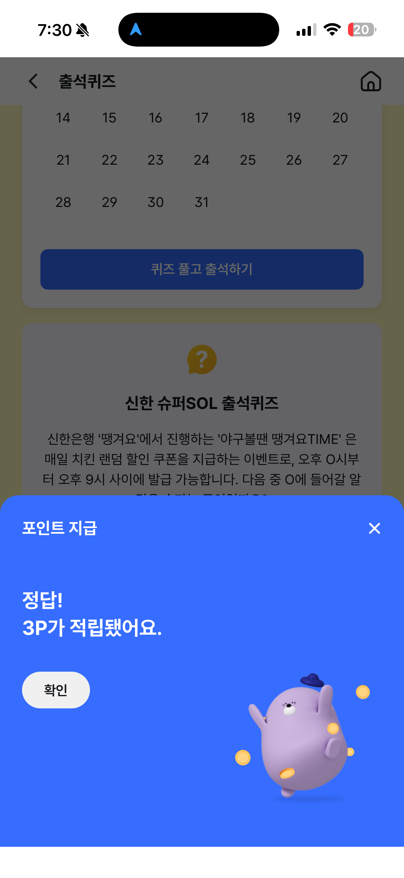 신한 슈퍼SOL 출석퀴즈 정답은 5시 입니다