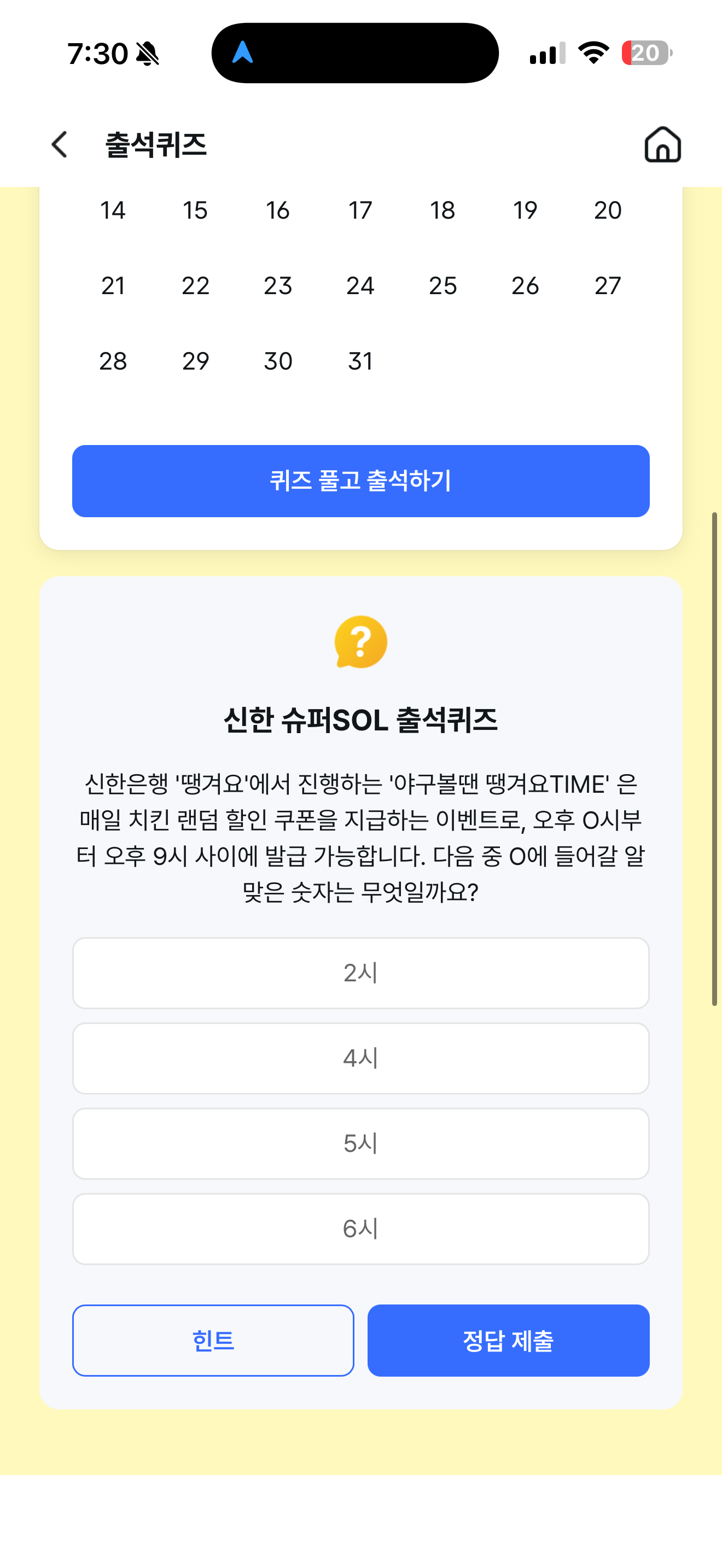 신한 슈퍼SOL 출석퀴즈 정답은 5시 입니다