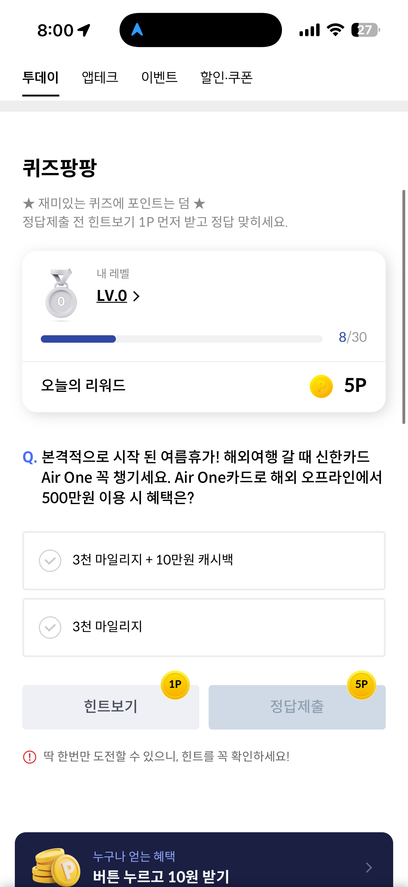 신한카드 퀴즈팡팡 정답은 3천 마일리지 + 10만원 캐시백 입니다