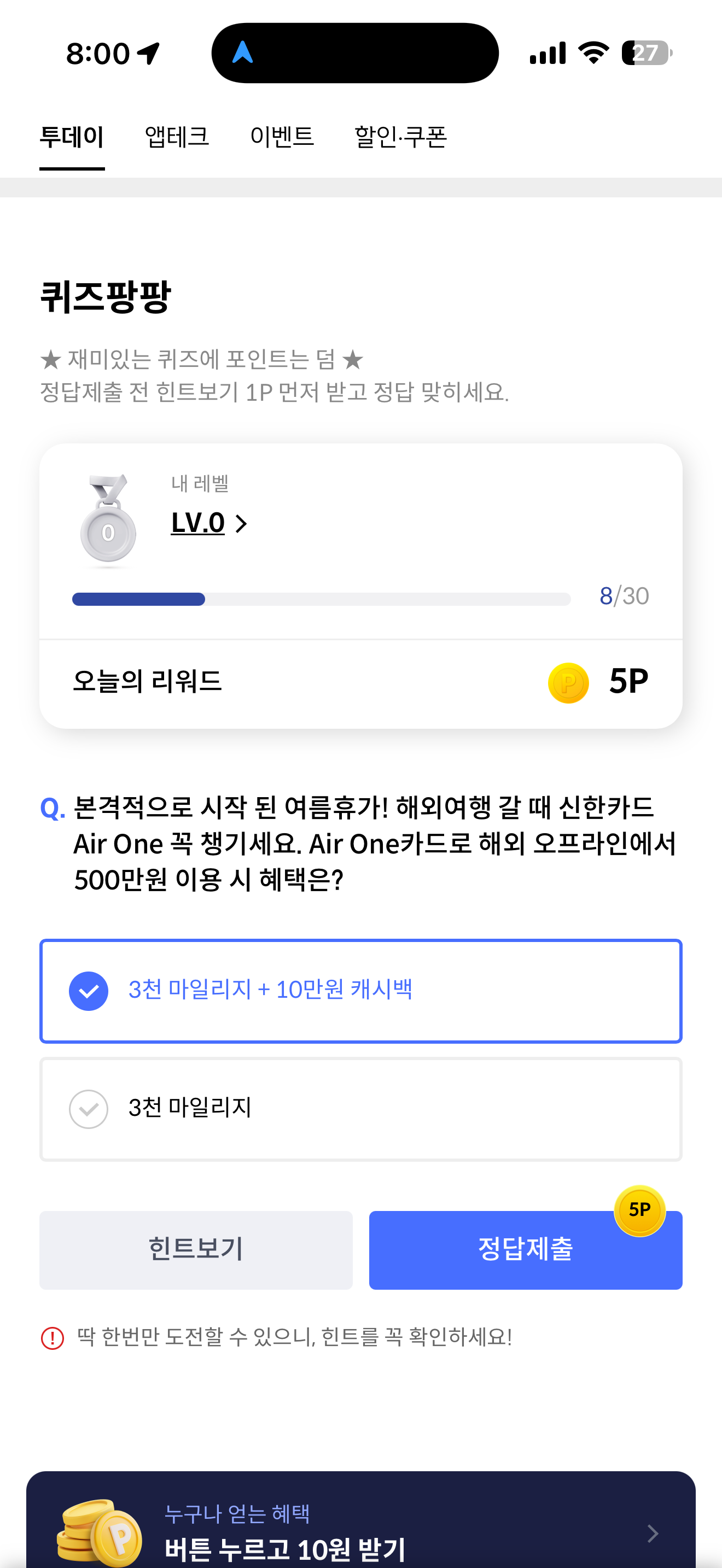 신한카드 퀴즈팡팡 정답은 3천 마일리지 + 10만원 캐시백 입니다