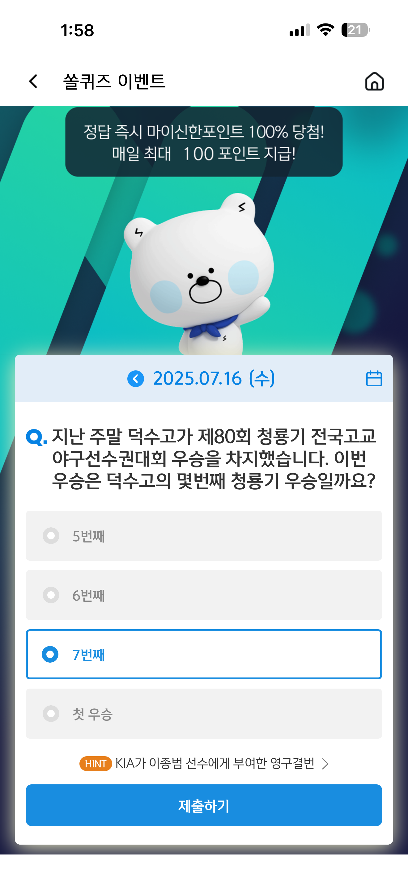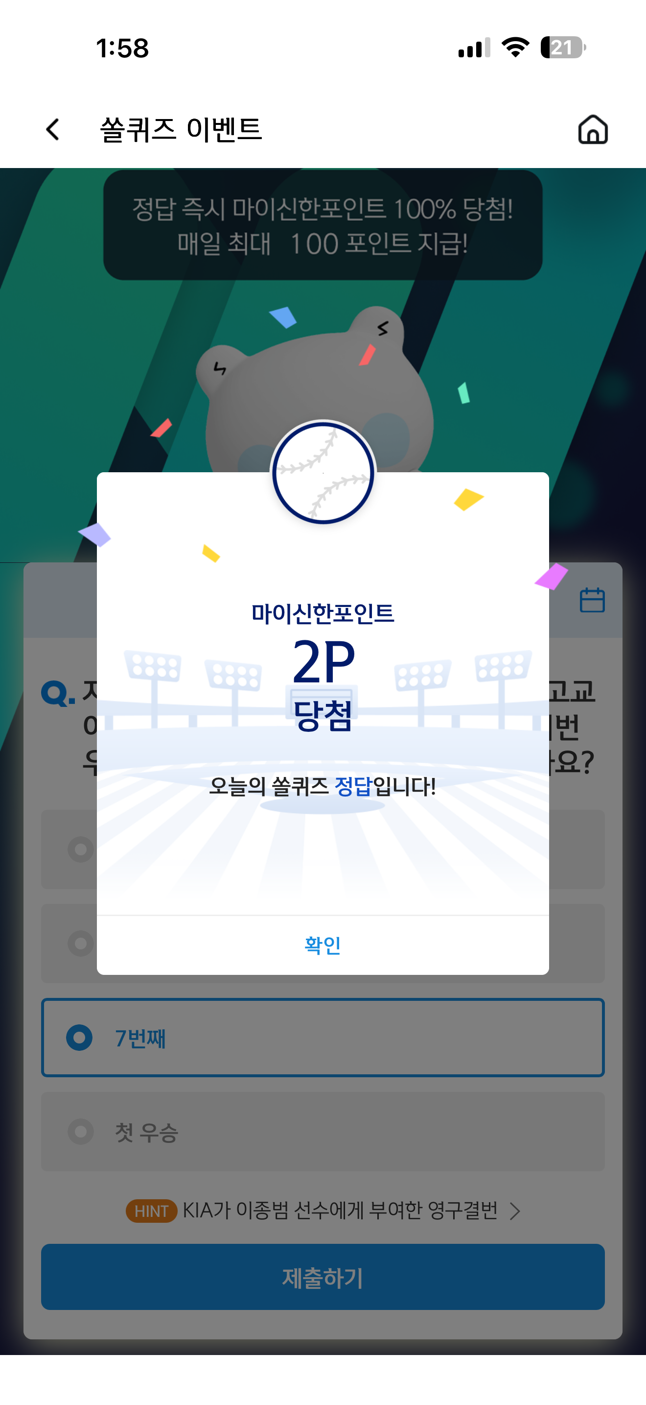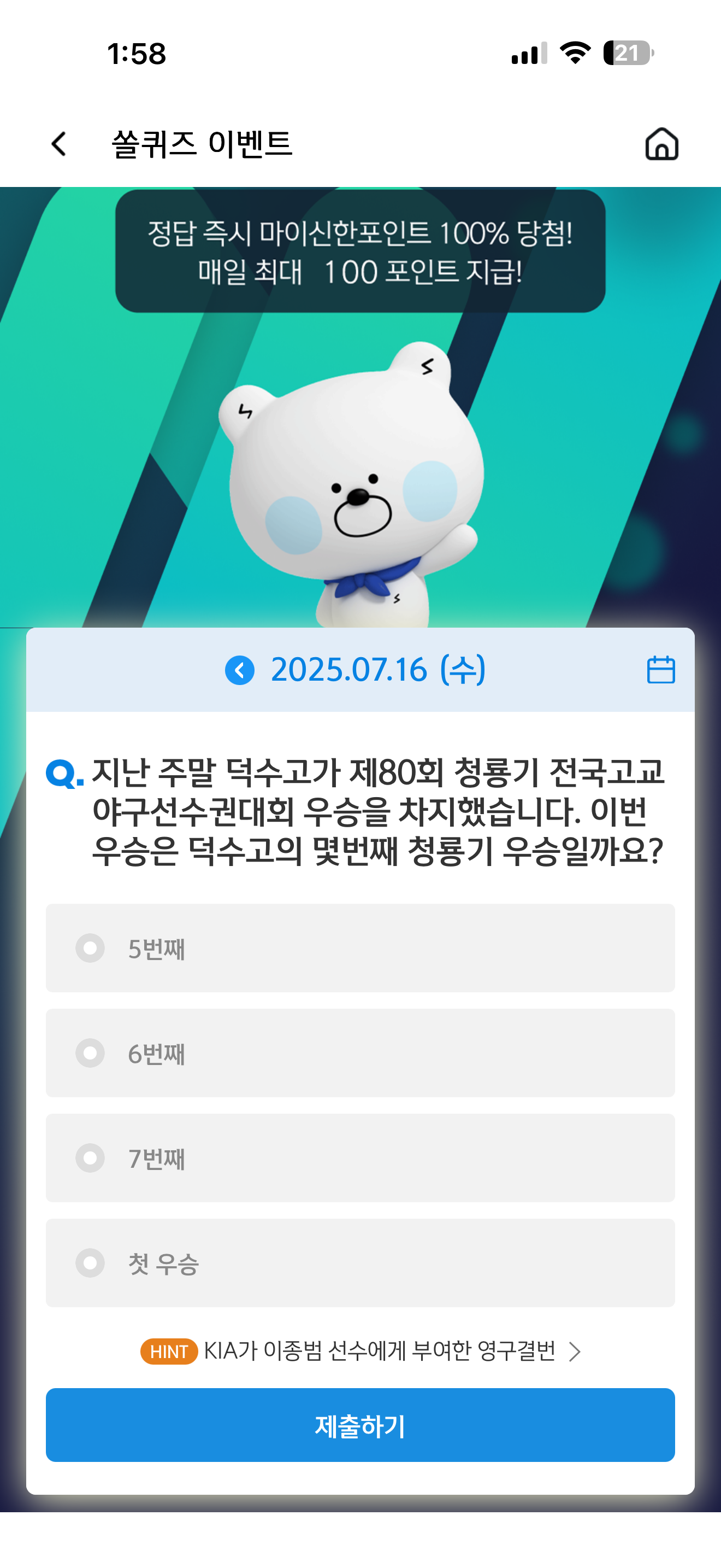 신한 슈퍼SOL 야구/상식 쏠퀴즈 정답은 7번째 입니다