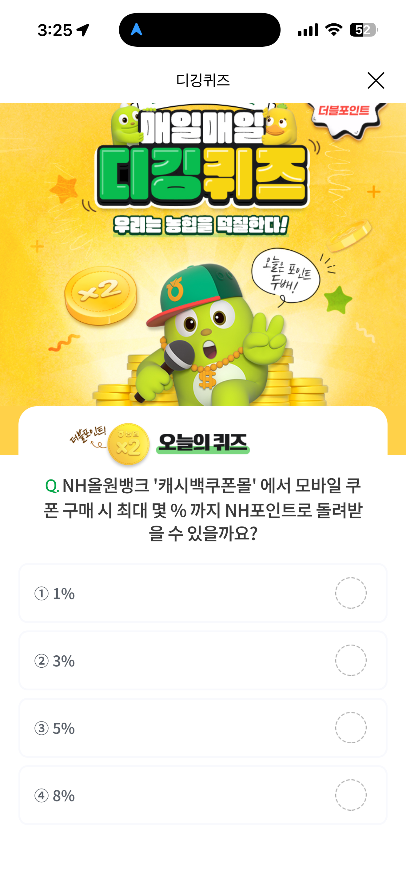 NH올원뱅크 디깅퀴즈 정답은 8% 입니다