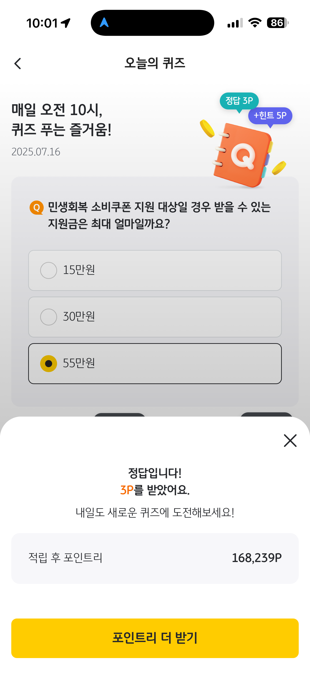 KB pay 오늘의 퀴즈 7월 16일 정답(민생회복 소비쿠폰 지원 대상일 경우 받을 수 있는 지원금은 최대 얼마일까요?)