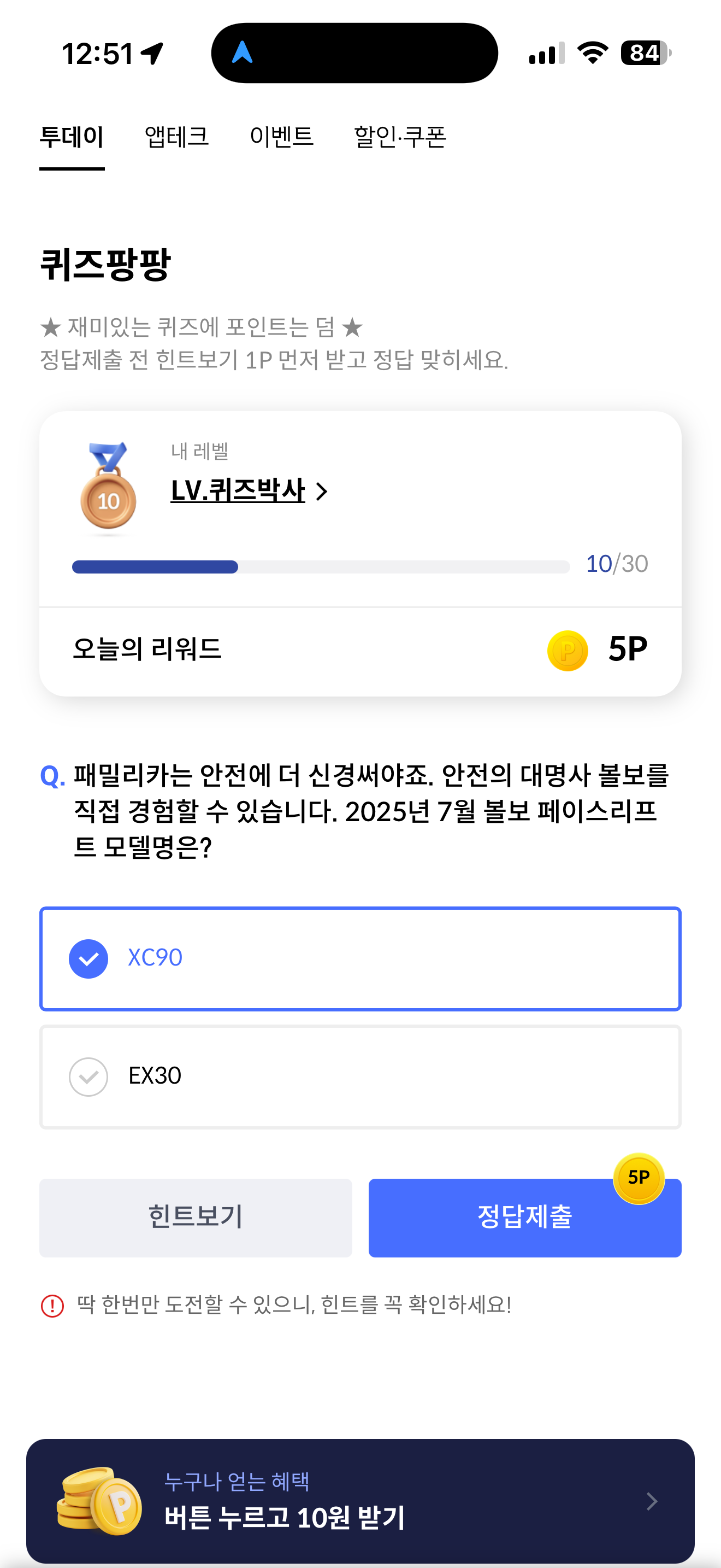 신한카드 퀴즈팡팡 정답은 XC90 입니다