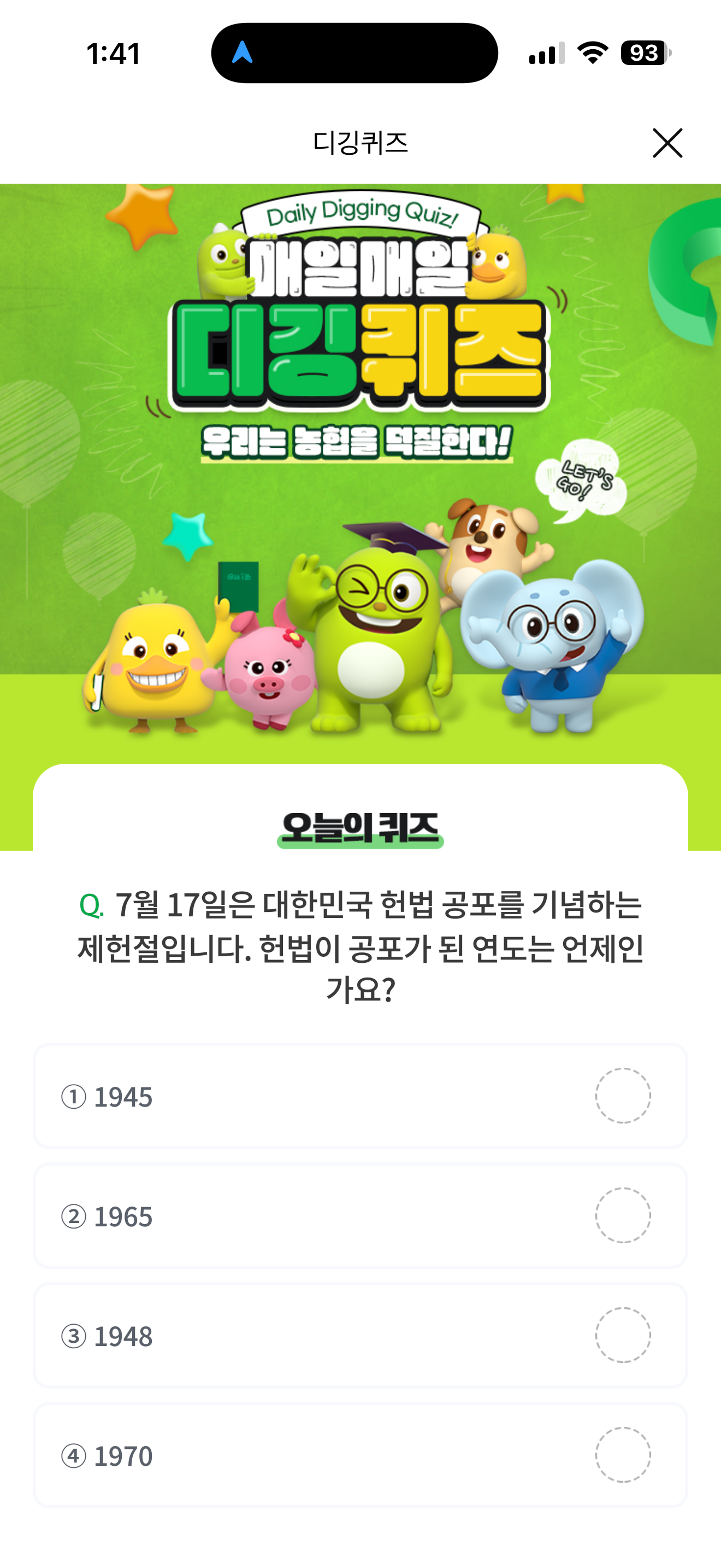 NH올원뱅크 디깅퀴즈 정답은 1948 입니다