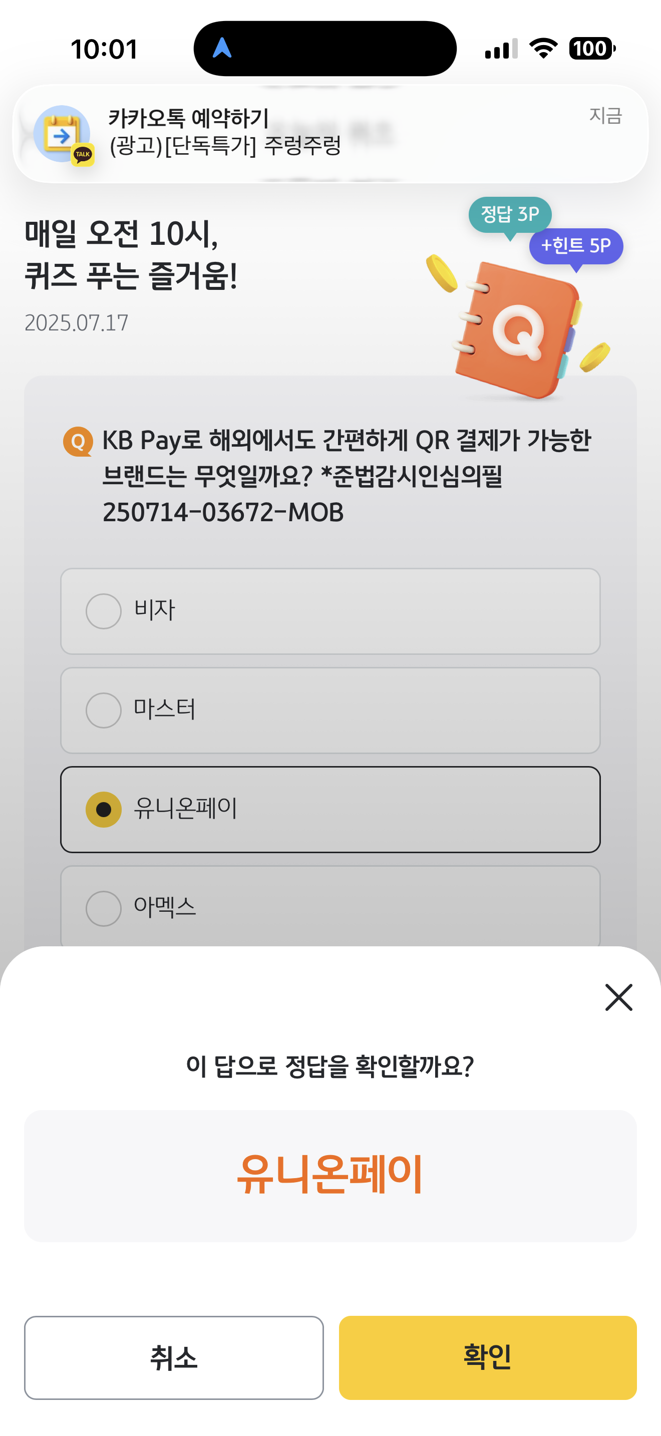 KB Pay 오늘의 퀴즈 정답은 유니온페이 입니다