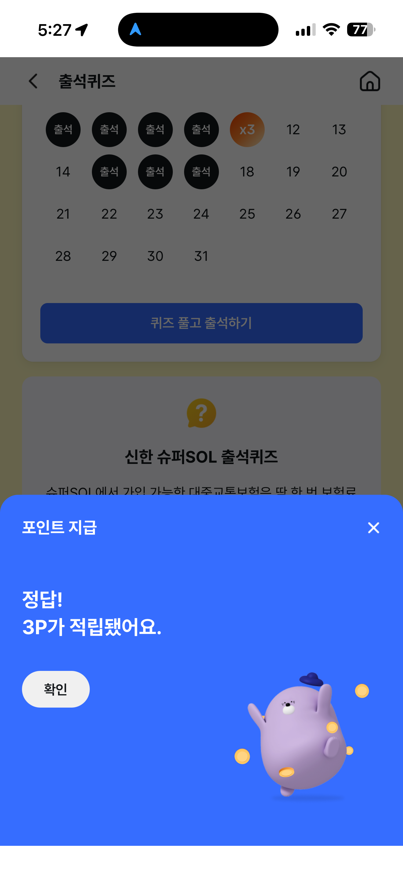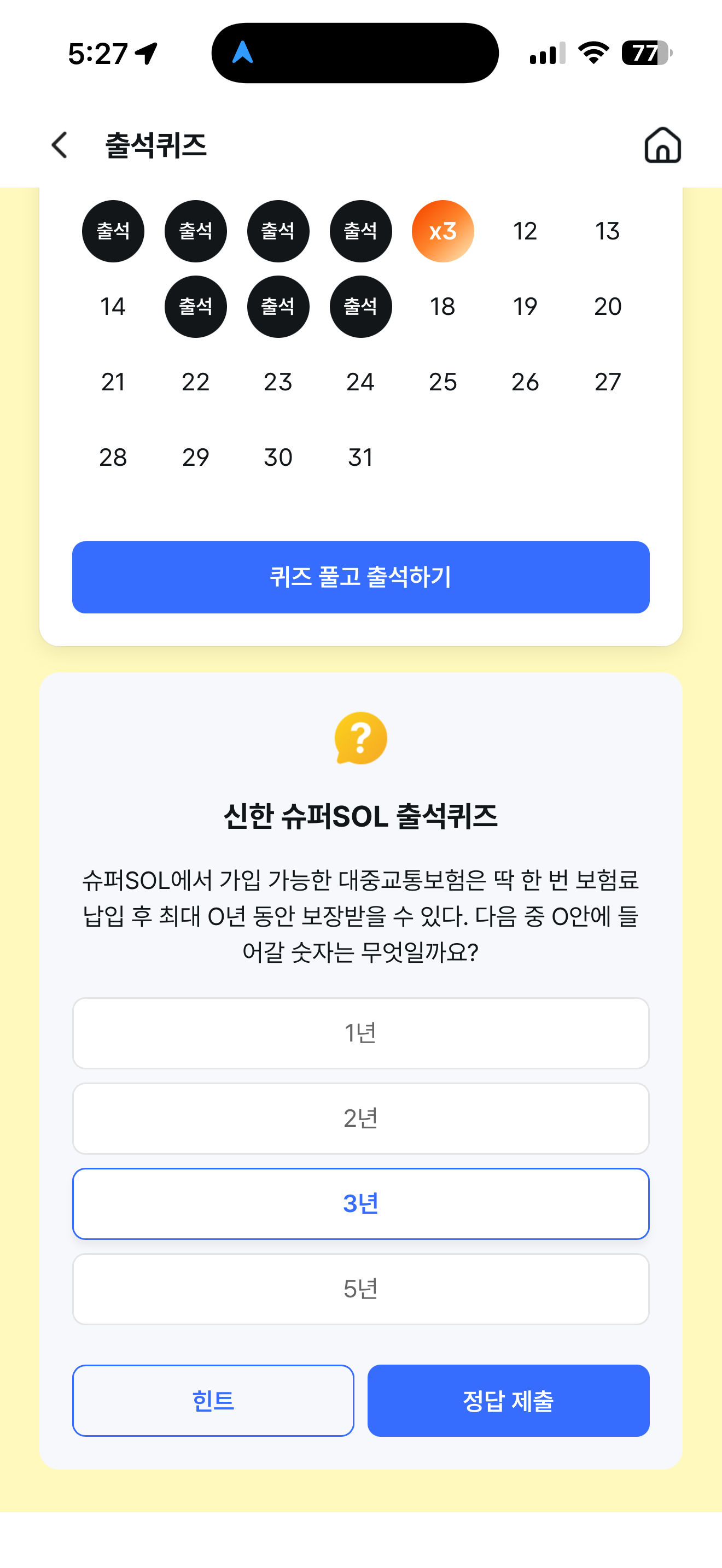 신한 슈퍼SOL 출석퀴즈 정답은 3년 입니다