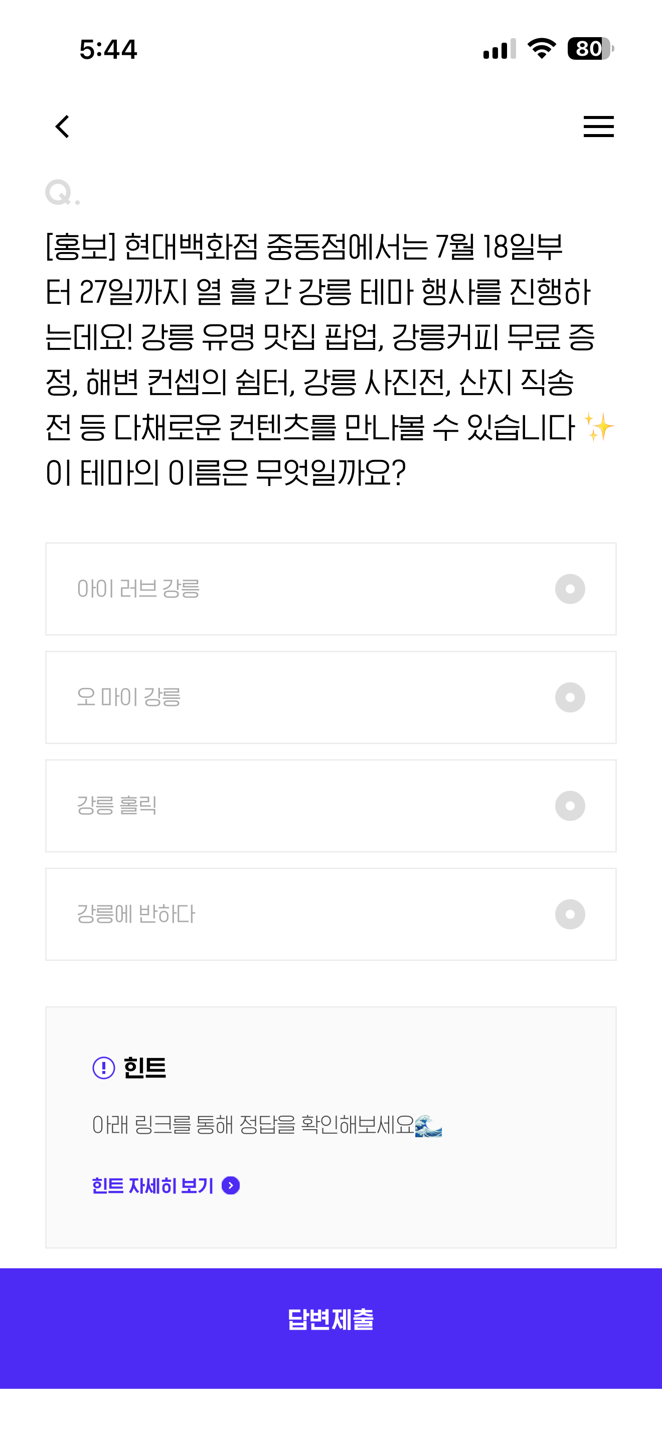 현대백화점 중동점에서는 7월 18일부터 27일까지 열 흘 간 강릉 테마 행사를 진행하는데요! 강릉 유명 맛집 팝업, 강릉커피 무료 증정, 해변 컨셉의 쉼터, 강릉 사진전, 사진 직송전 등 다채로운 컨텐츠를 만나볼 수 있습니다 이 테마의 이름은 무엇일까요? 보기는 1. 아이 러브 강릉 2. 오 마이 강릉 3. 강릉 홀릭 4. 강릉에 반하다 입니다