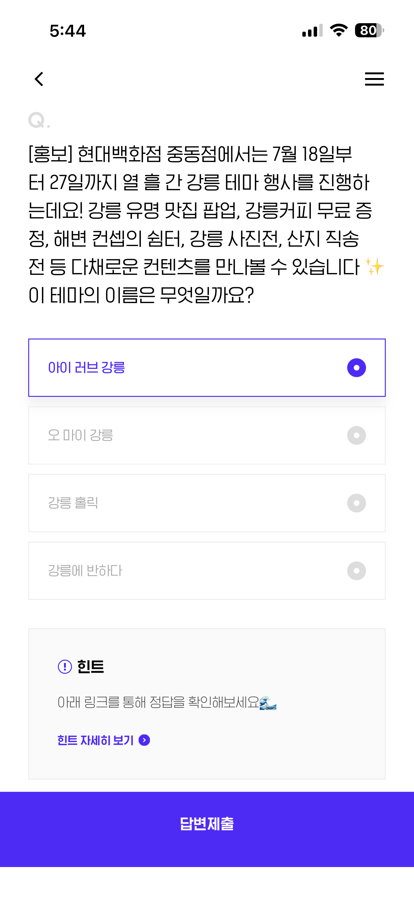 H포인트 퀴즈 정답은 아이 러브 강릉 입니다