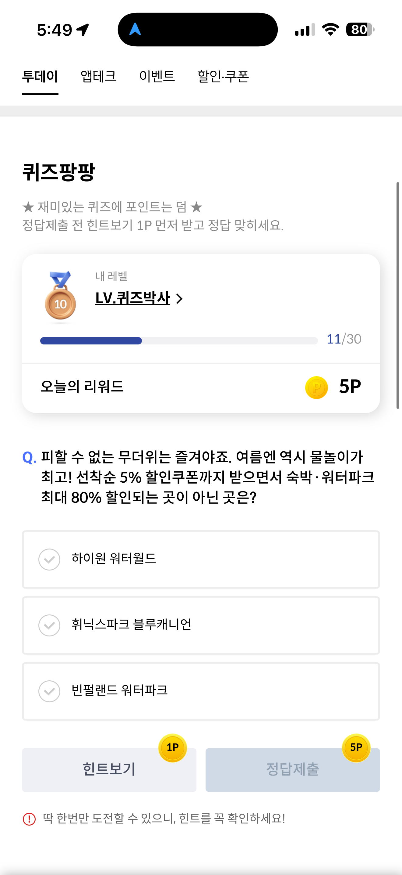 피할 수 없는 무더위는 즐겨야죠. 여름엔 역시 물놀이가 최고! 선착순 5% 할인쿠폰까지 받으면서 숙박 워터파크 최대 80% 할인되는 곳이 아닌 곳은? 보기는 1. 하이원 워터월드 2. 휘닉스파크 블루캐니언 3. 빈펄랜드 워터파크 입니다
